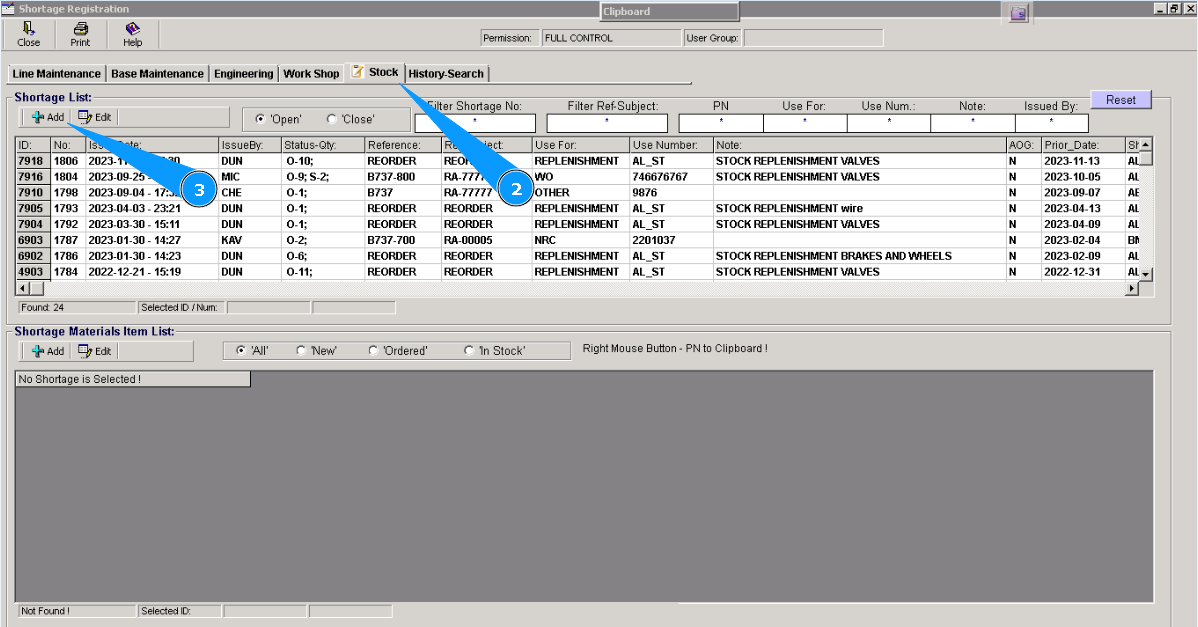 16. Click on the button "Add" in the window "Shortage Material Item List", for adding materials or tools to POR.