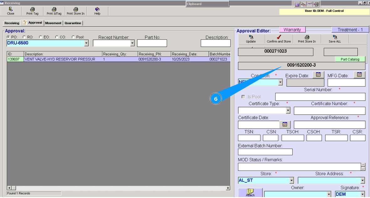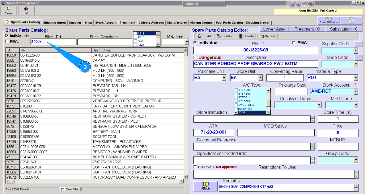 3. Enter the part number of the component or materials in the searching field "Filter-Part Number" and press the button "Enter" on the keyboard.