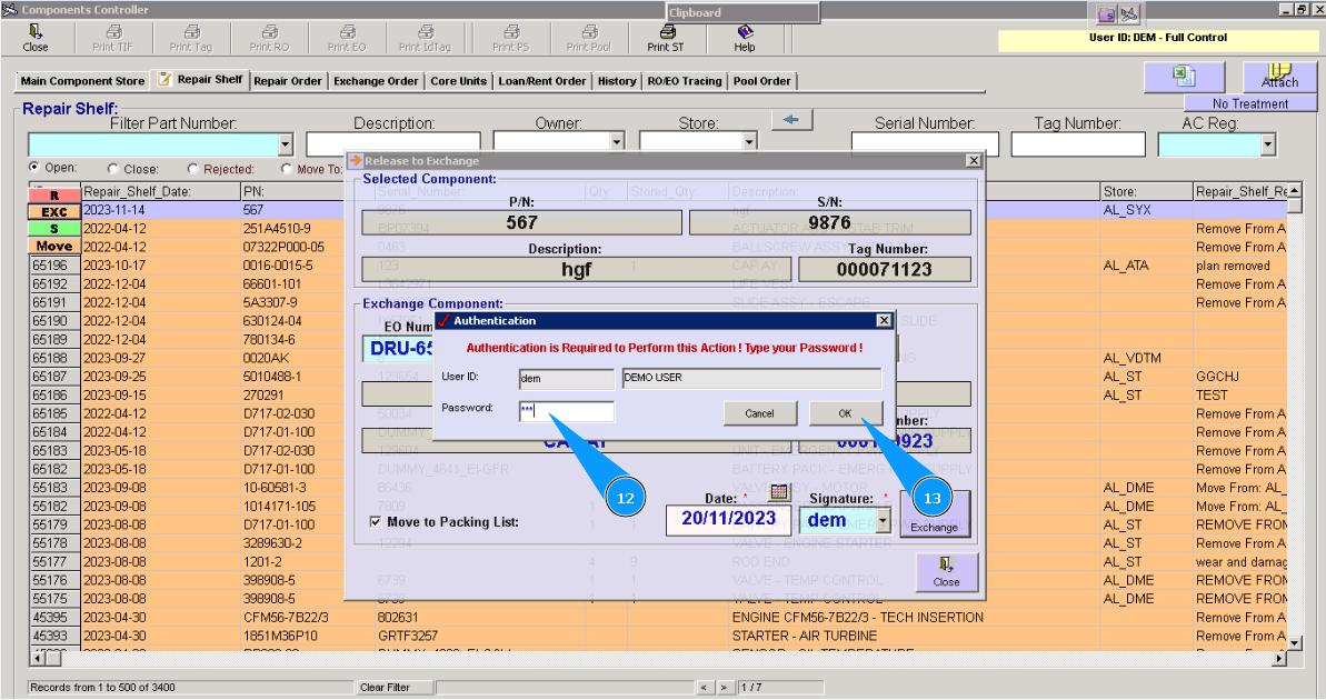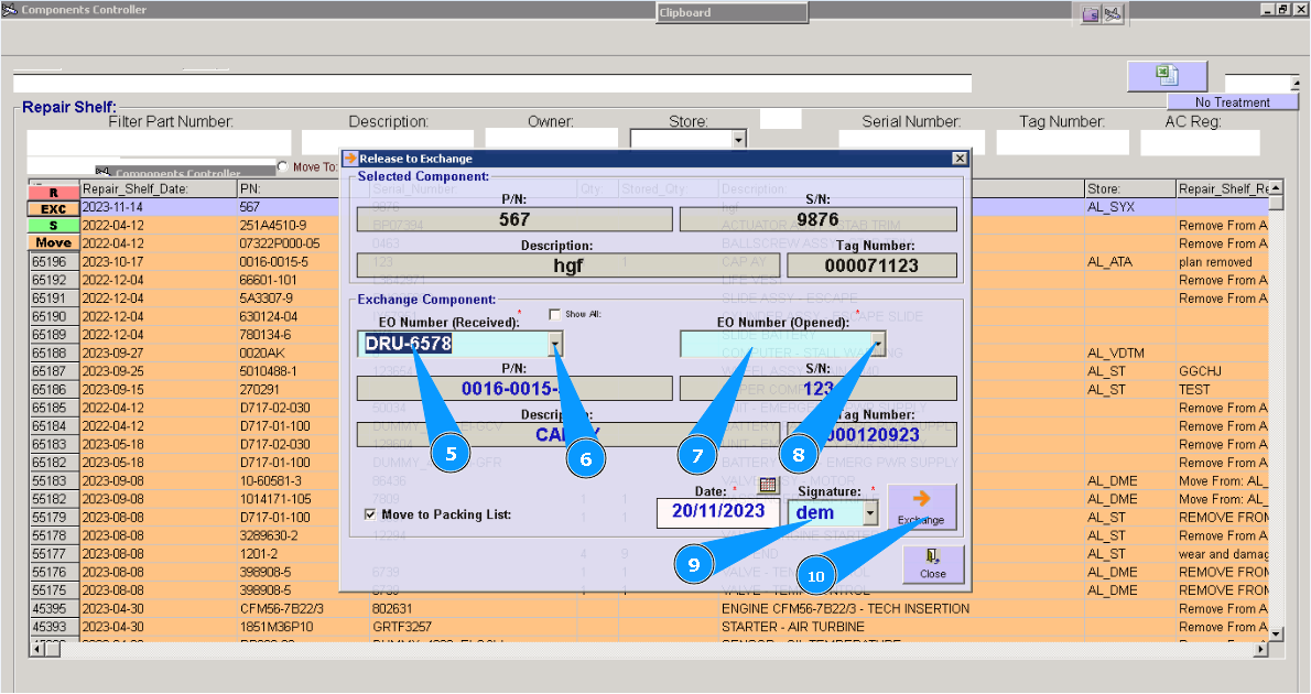 5. If the component for changing an unserviceable one is well received on the store, enter the Exchange Order number in the field "EO Number (Received).". Note: Information about unserviceable components is automatically appeared from tab "Repair Shelf".