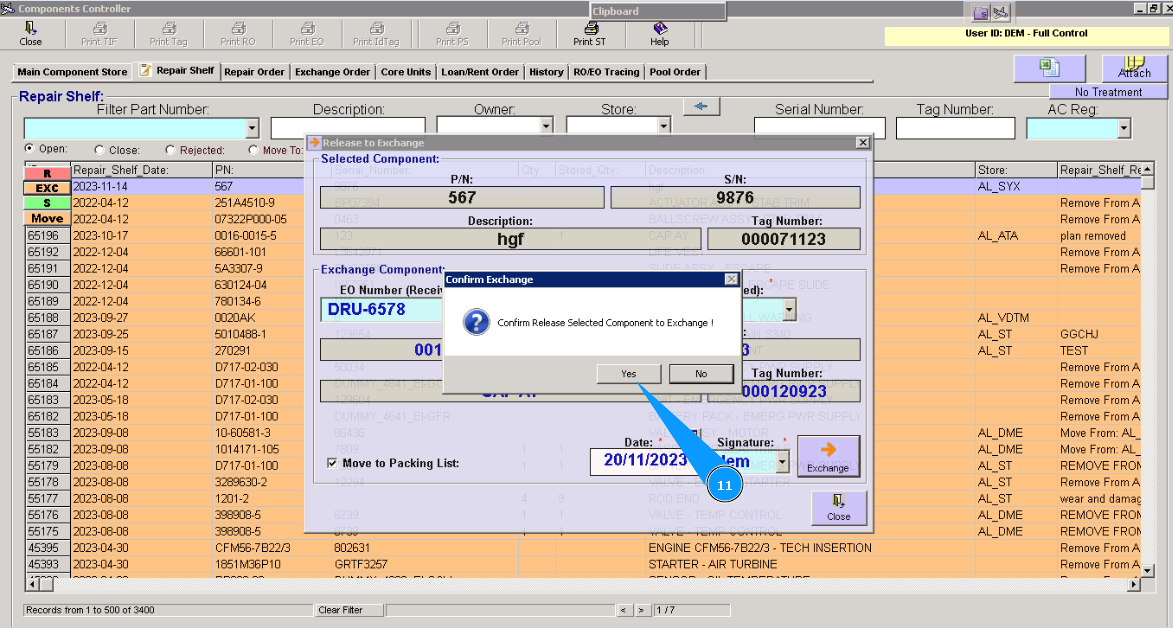 11. Click on the button "Yes", to confirm linking between the component and "Exchange Order".