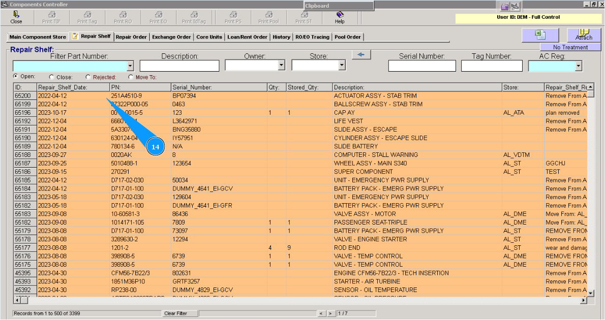 3. Use the available filters, __"Filter Part Number," "Store," or others, to find the necessary component. Highlight the component in the window "Repair Shelf".