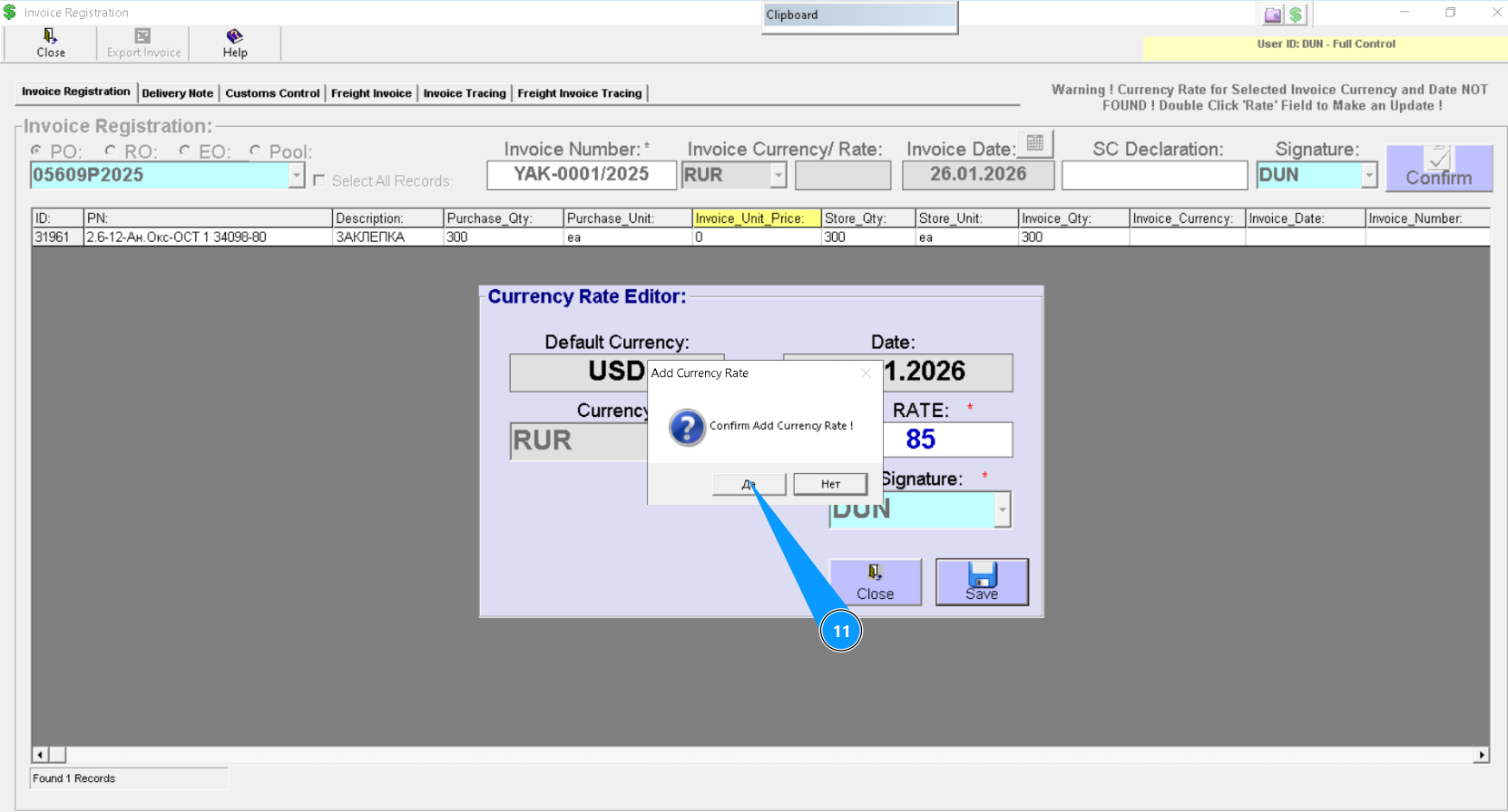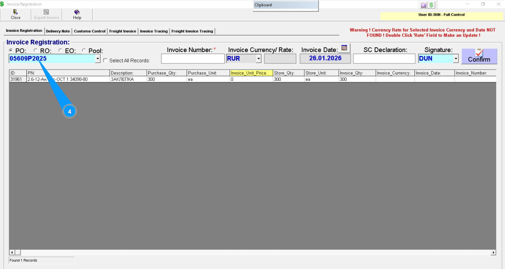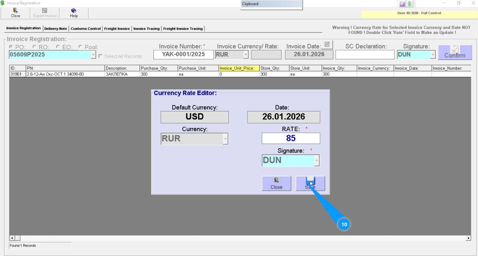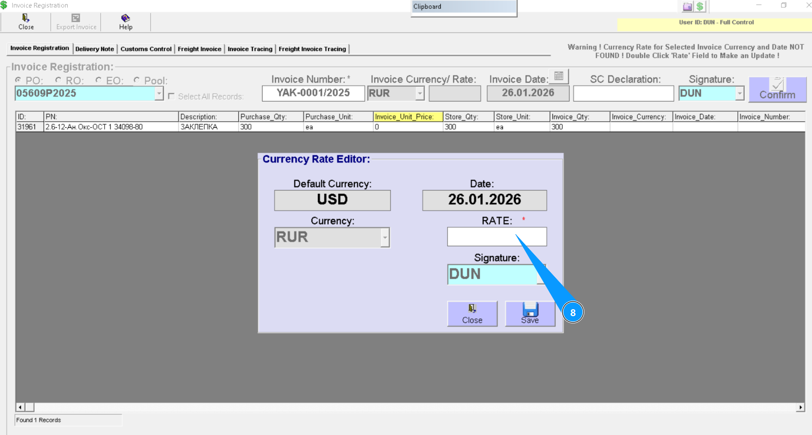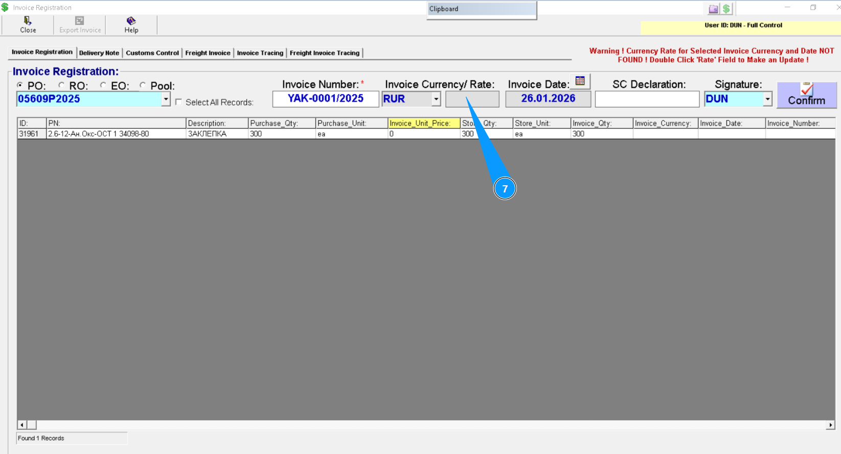 7. If Invoice Currency/Rate is not specified, click twice on the field "Rate".