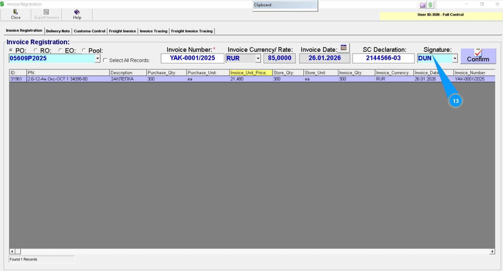 13. Enter the who registrated invoice in the field "Signature" and press the button "Enter" on your keyboard or select from dropdown list.