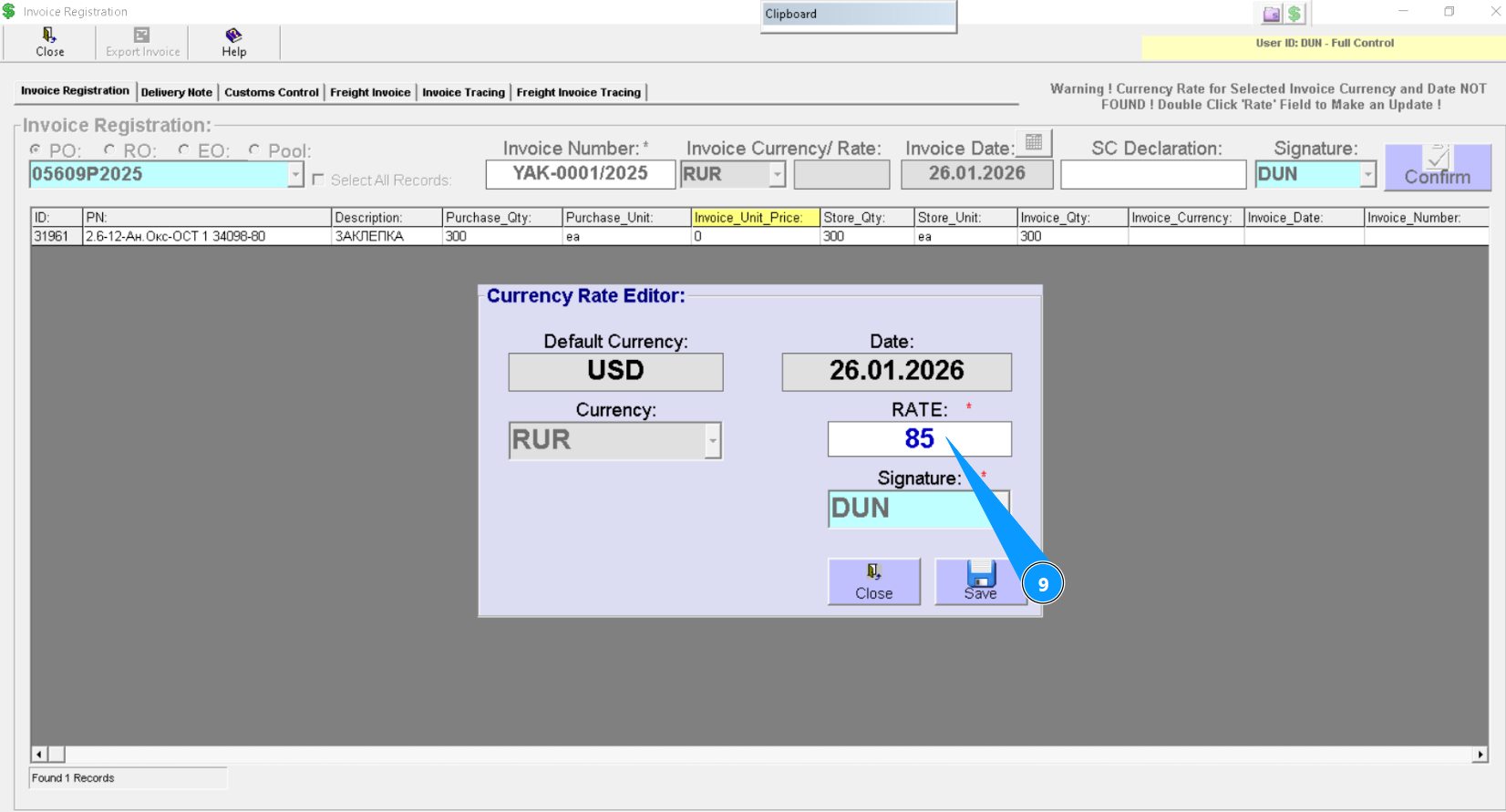 8. Check that "Invoice Currency Rate Editor" is showed on your screen.