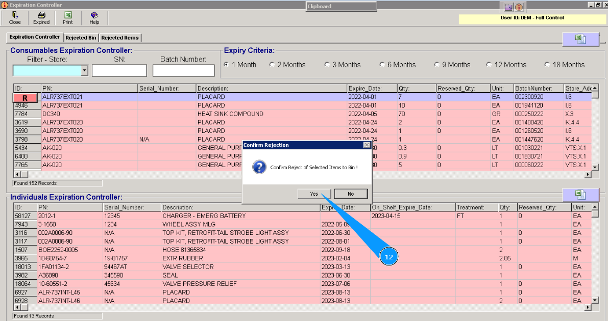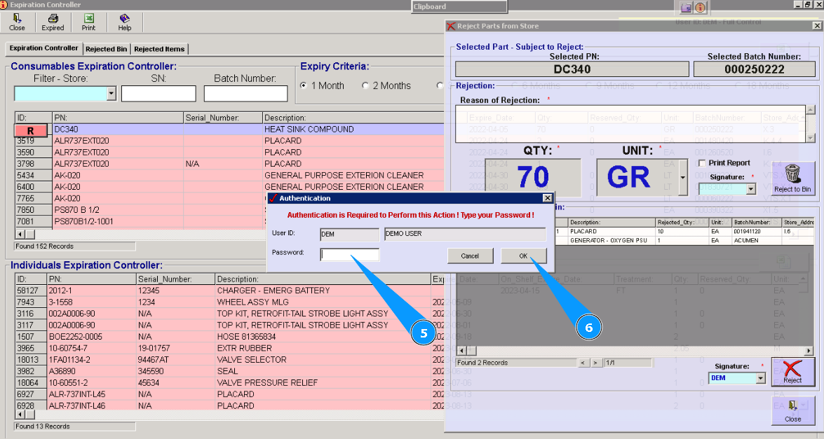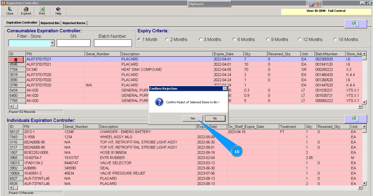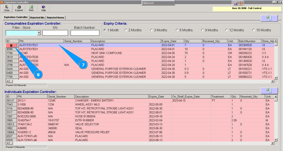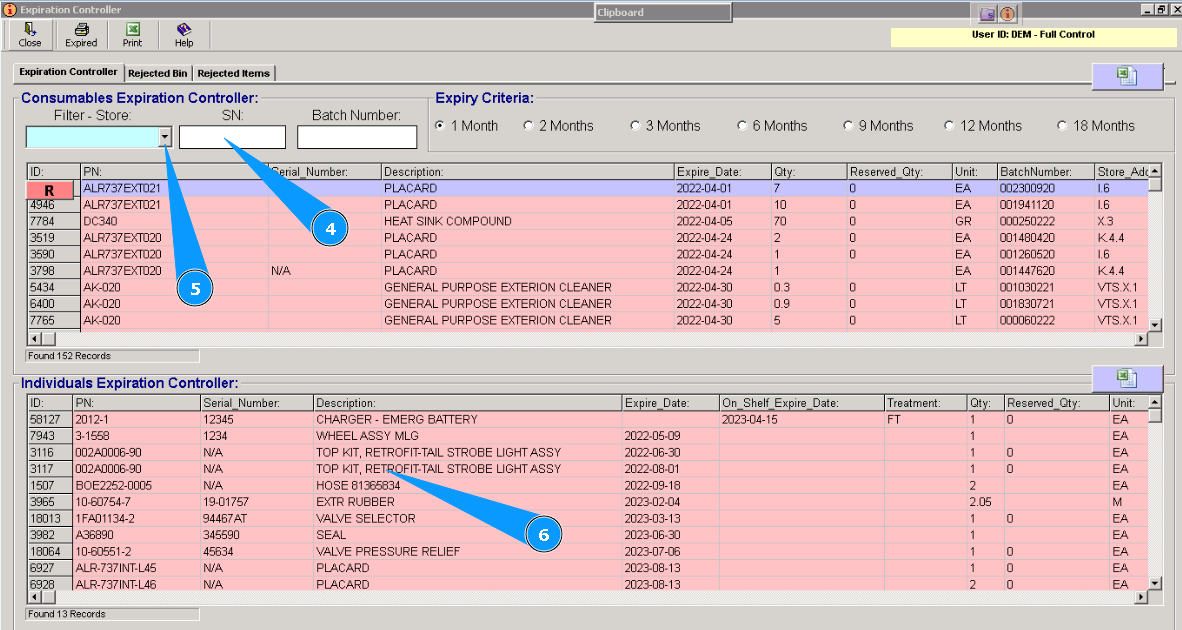 6. Find applicable material in the window "Consumables Expiration Controller" or components in the window "Individuals Expiration Controller".
