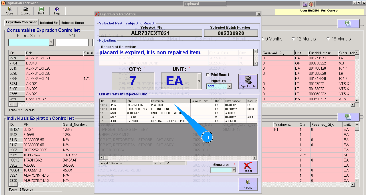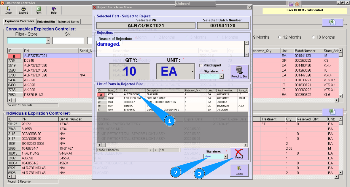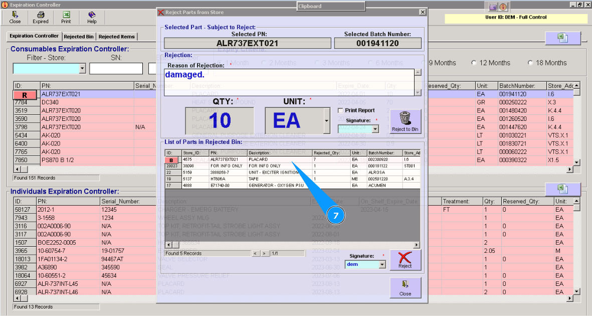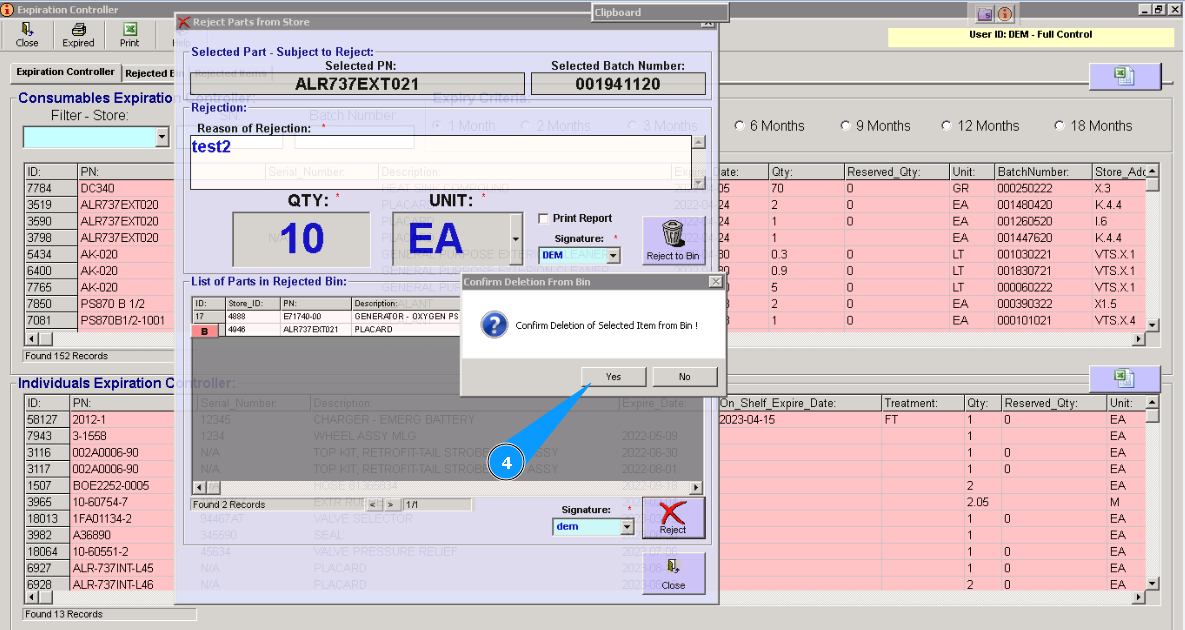 - Method №1. Permanent rejection from the window "List of Parts in Rejected Bin".