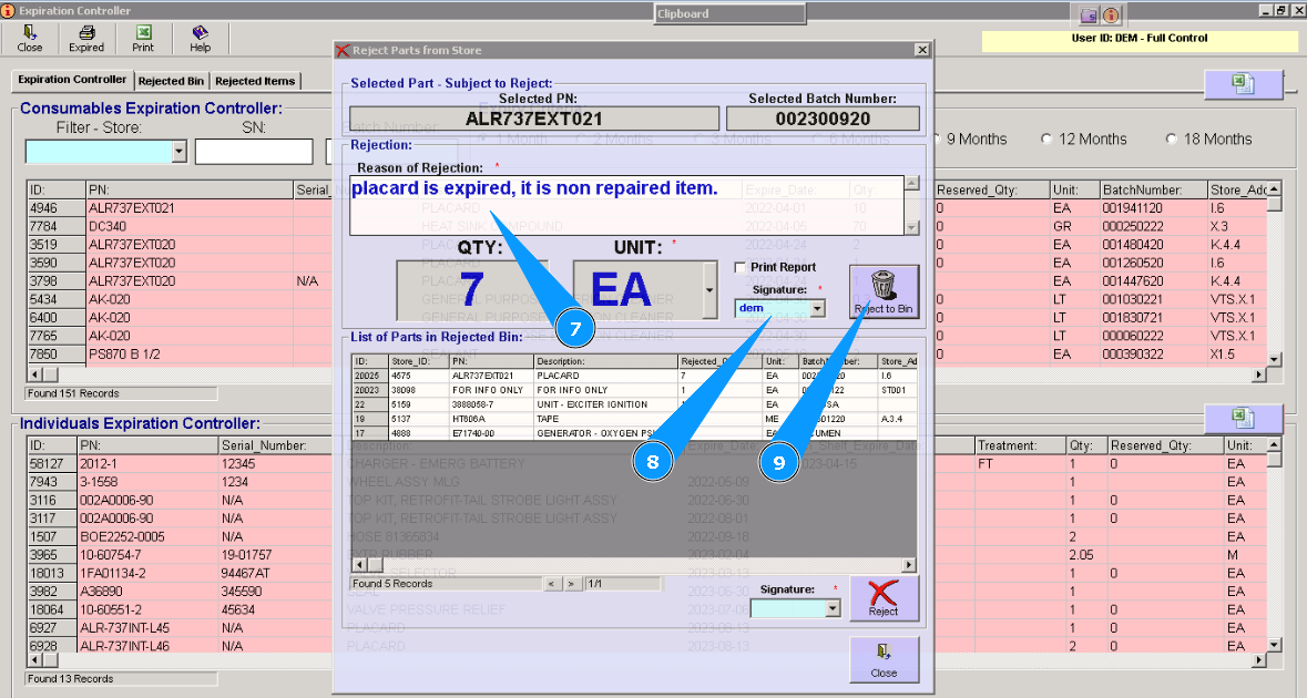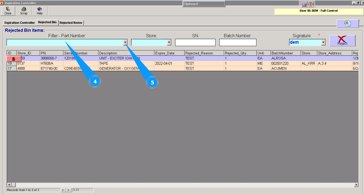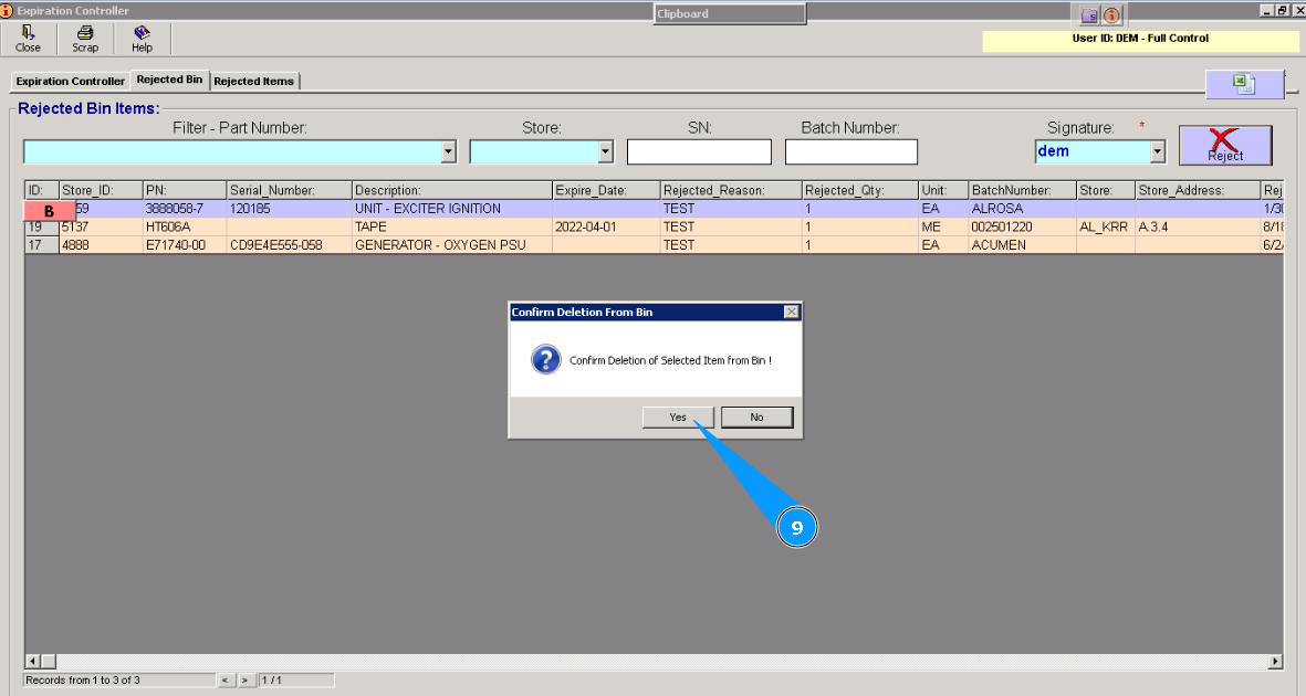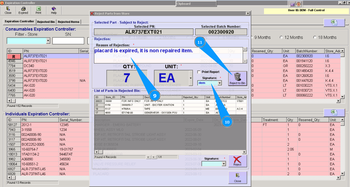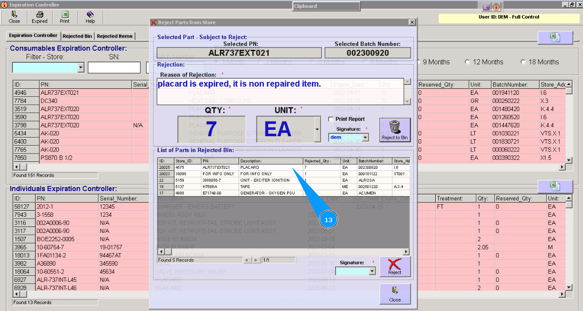 - Method №1. Permanent rejection from the window "List of Parts in Rejected Bin".
