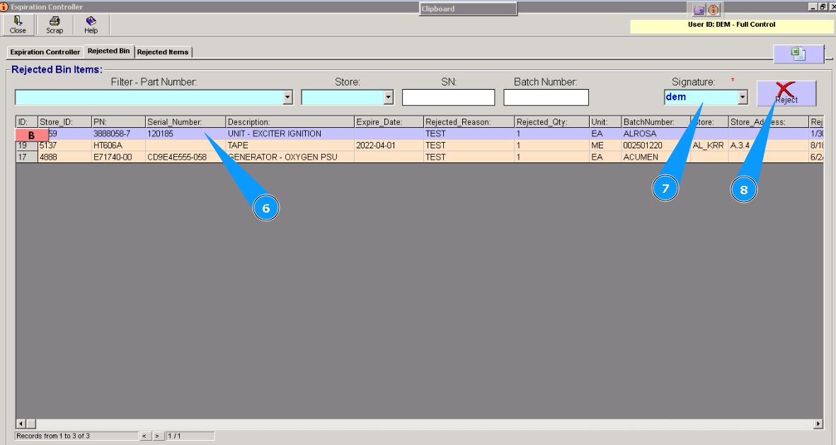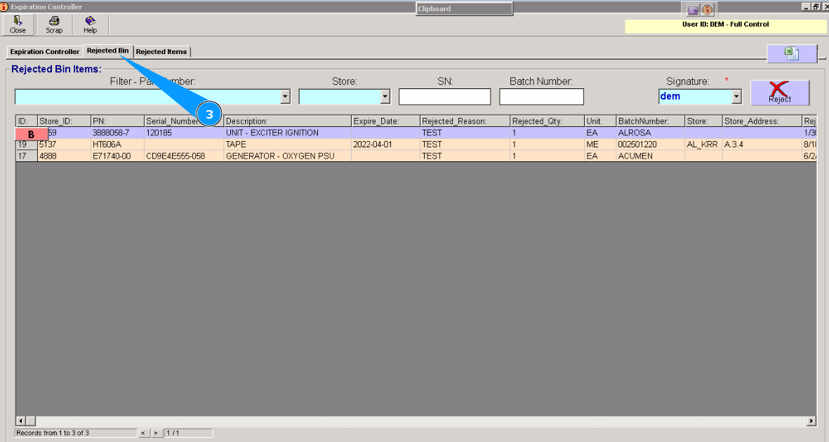 7. Visually check that the line with materials or component is disappeared in the window "List of Parts in Rejected Bin". Part is permanently rejected.