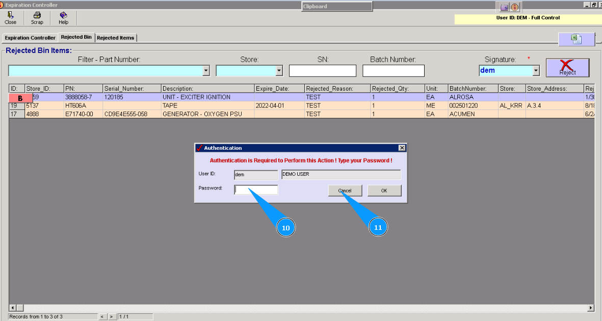 12. Visually check that line with materials or component is disappeared in the window "List of Parts in Rejected Bin". Part is permanently rejected.