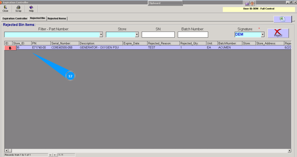 13. Visually check that the new line with the rejected part is appeared in the window "List of Parts in Rejected Bin".