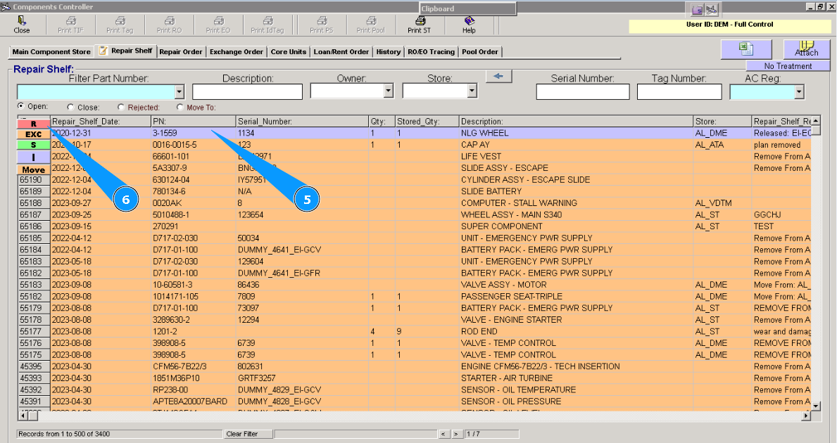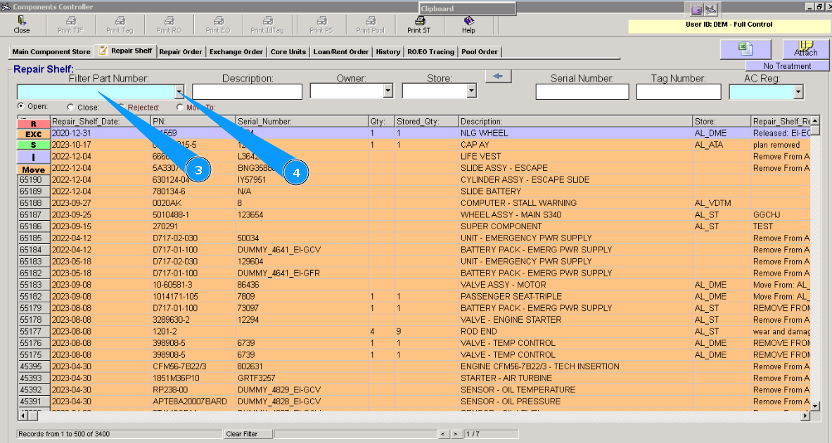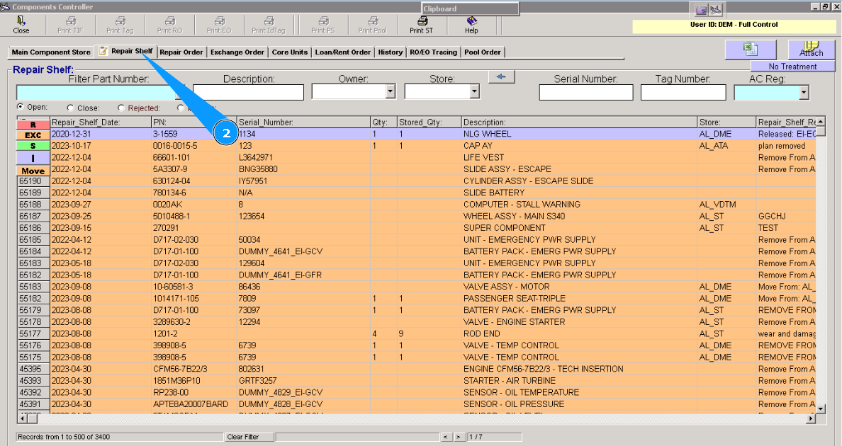 1. For temporary rejection of components or materials from the repair shelf, please go to submodule "Components".