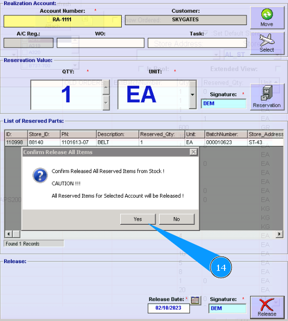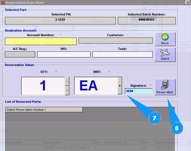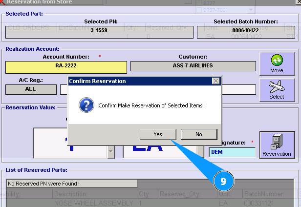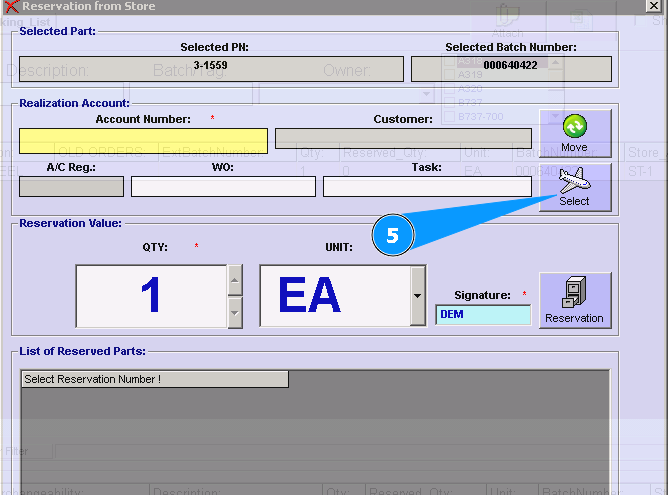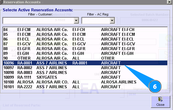 6. Select the applicable aircraft registration. Click twice by left hand mouse knob on the selected line.