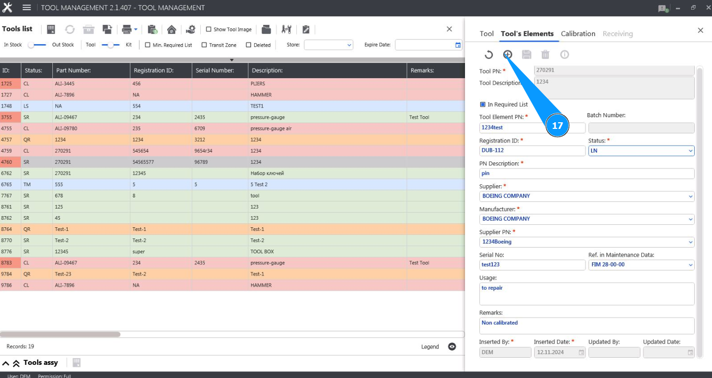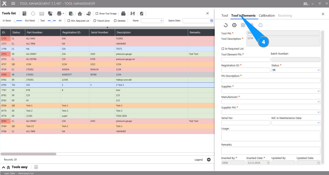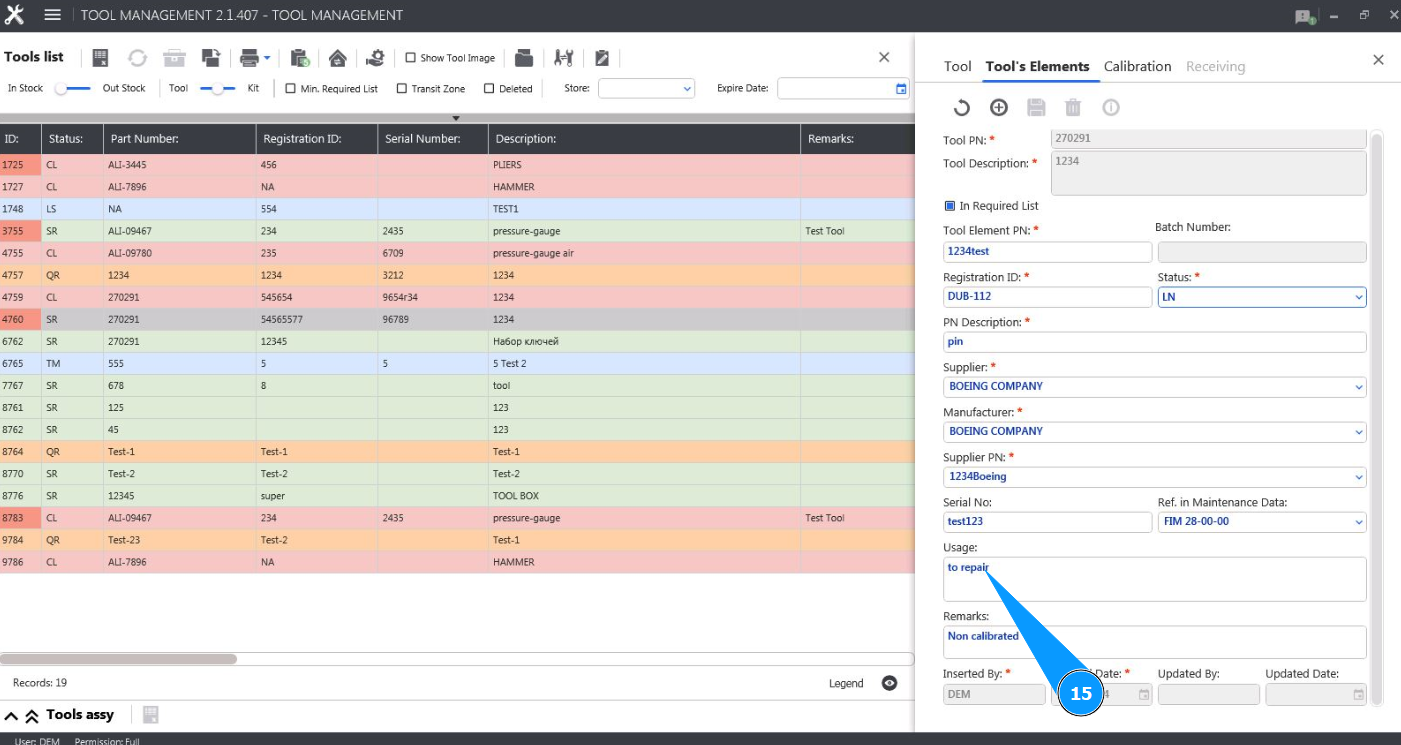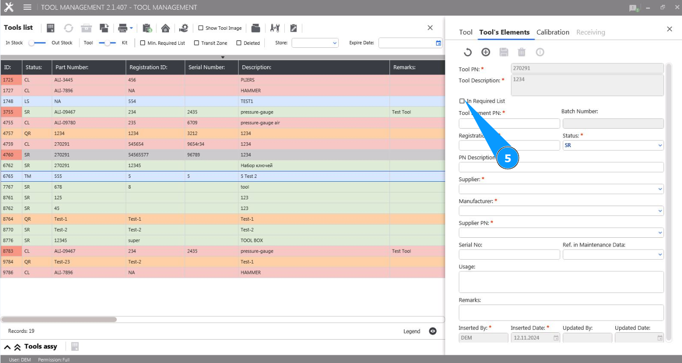 5. If necessary, put a marker for adding the tool's element of kit to the list of required tools in the field "In Required List".