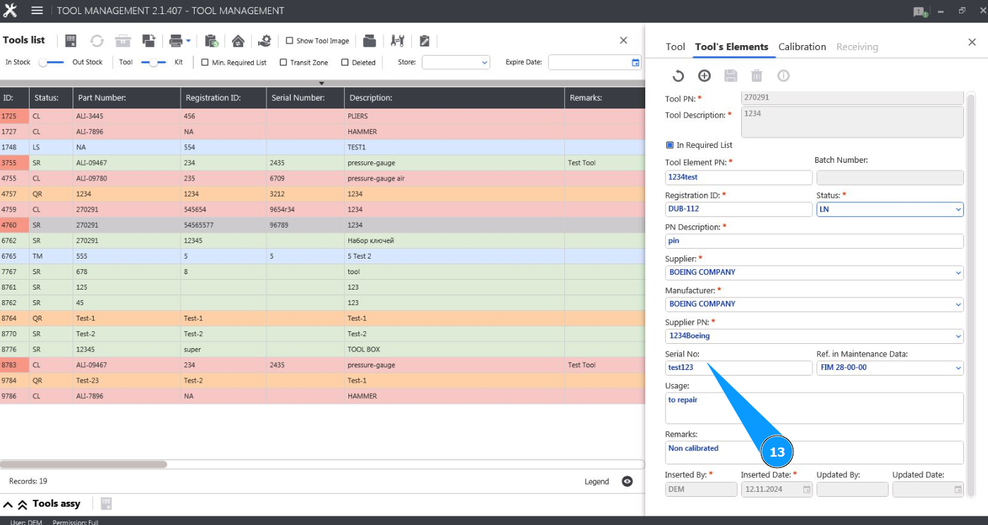 13. If necessary, enter the serial number of the tool's element of kit in the field **"Serial No."
