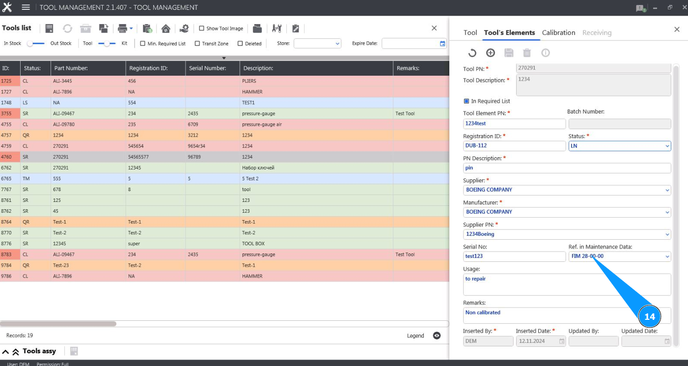 6. Enter the part number of the tool's element of kit in the field "Tool Element PN".