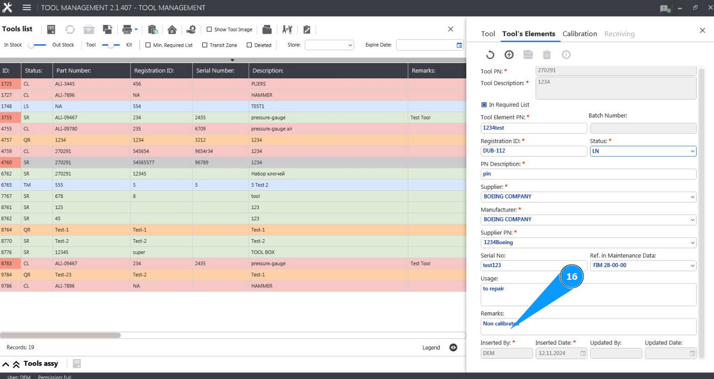 16. If necessary, enter any other information in the field "Remarks". Note: The login of the specialist who entered the data on the tool's element of kit and the date of entry will be displayed by the program automatically in the fields "Inserted By" and "Inserted Date".