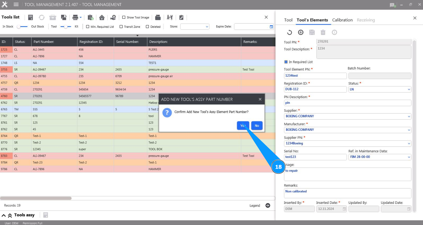 18. Click on the button "Yes" to confirm adding the new tool's element of kit.