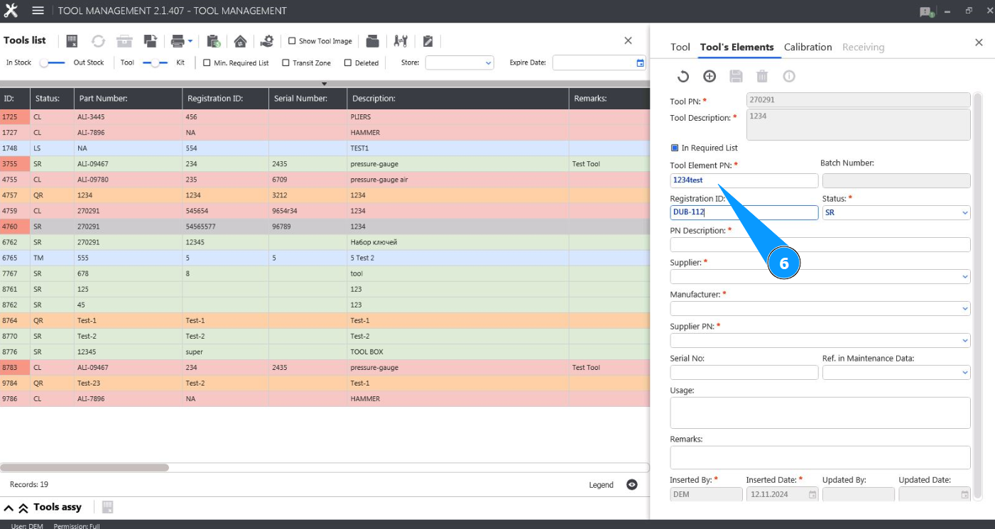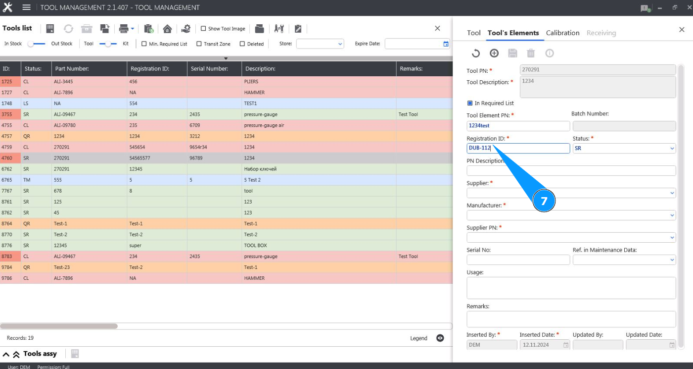 7. Enter the registration number of the tool's element of kit in the field "Registration ID".