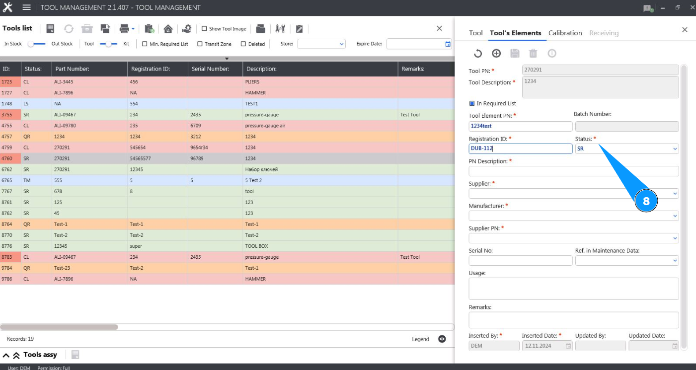 8. Select the status of the tool's element of kit from the dropdown list in the field "Status".