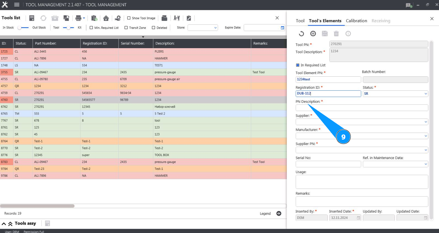 9. Enter the name of the tool's element of kit in the field "PN Description".