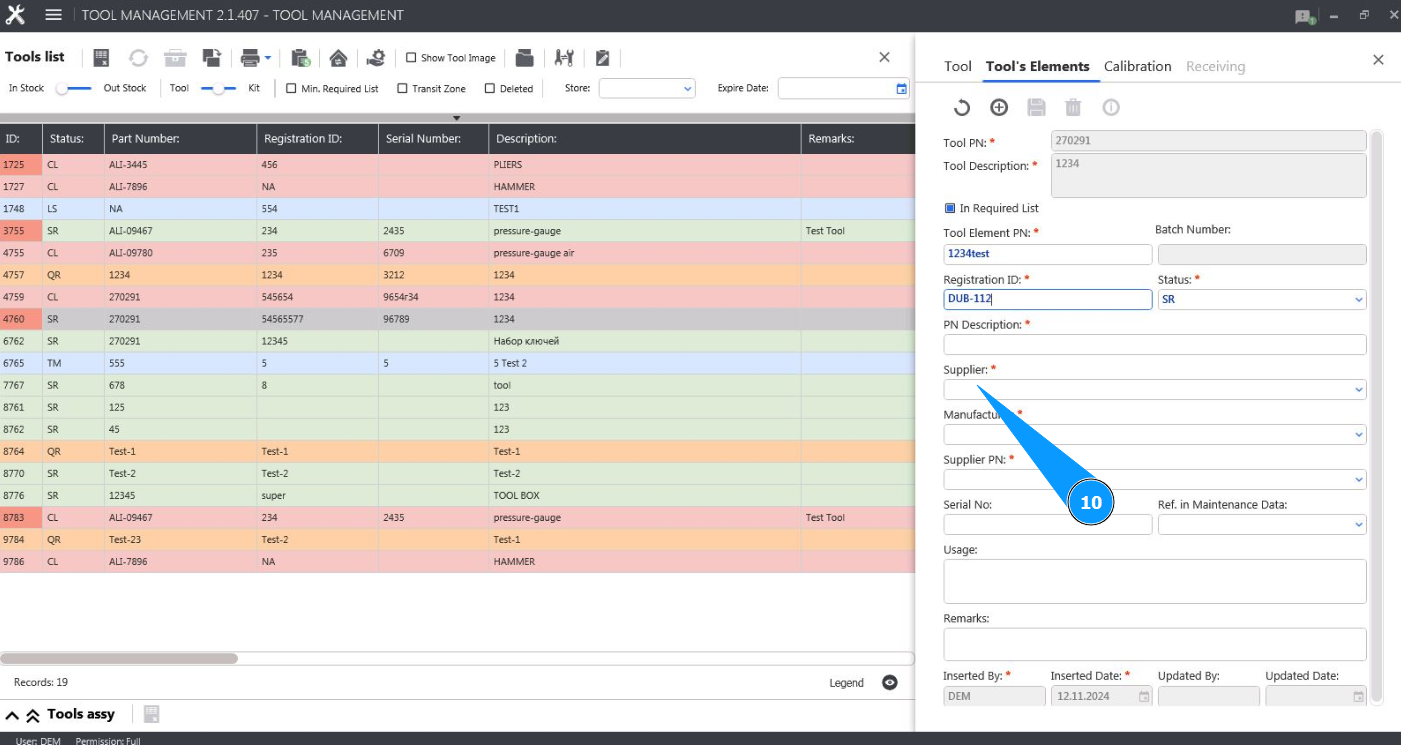 10. Enter the name of the tool's element of kit of supplier in the field "Supplier".