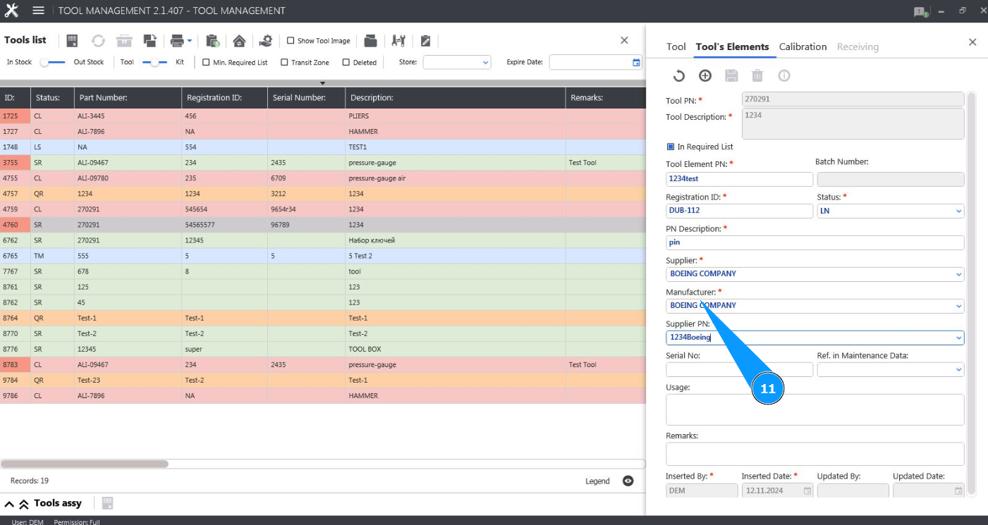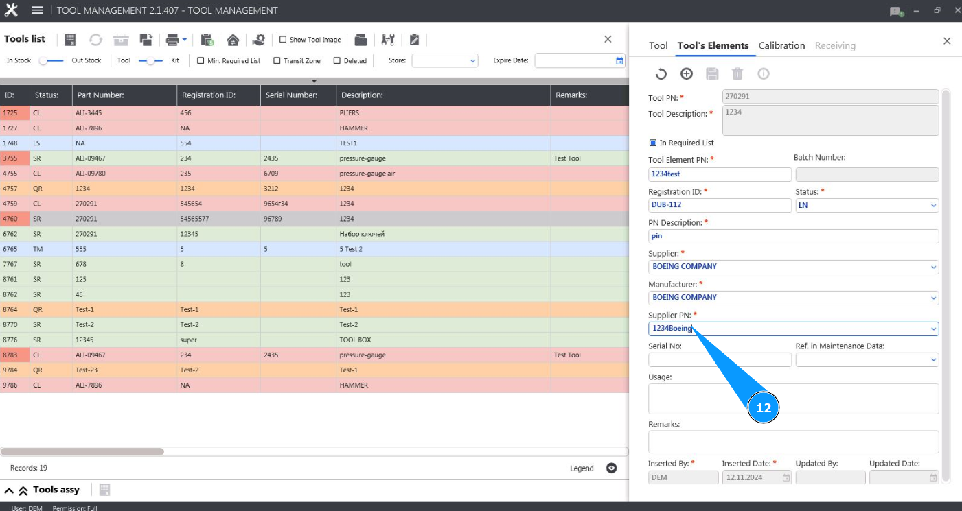 12. Enter the part number of the tool's element of kit of supplier in the field "Supplier PN".