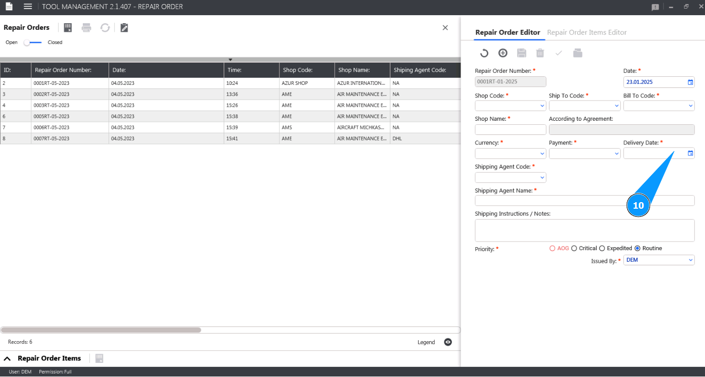 10. Enter the date the tool is returned from repair in the field "Delivery Date".