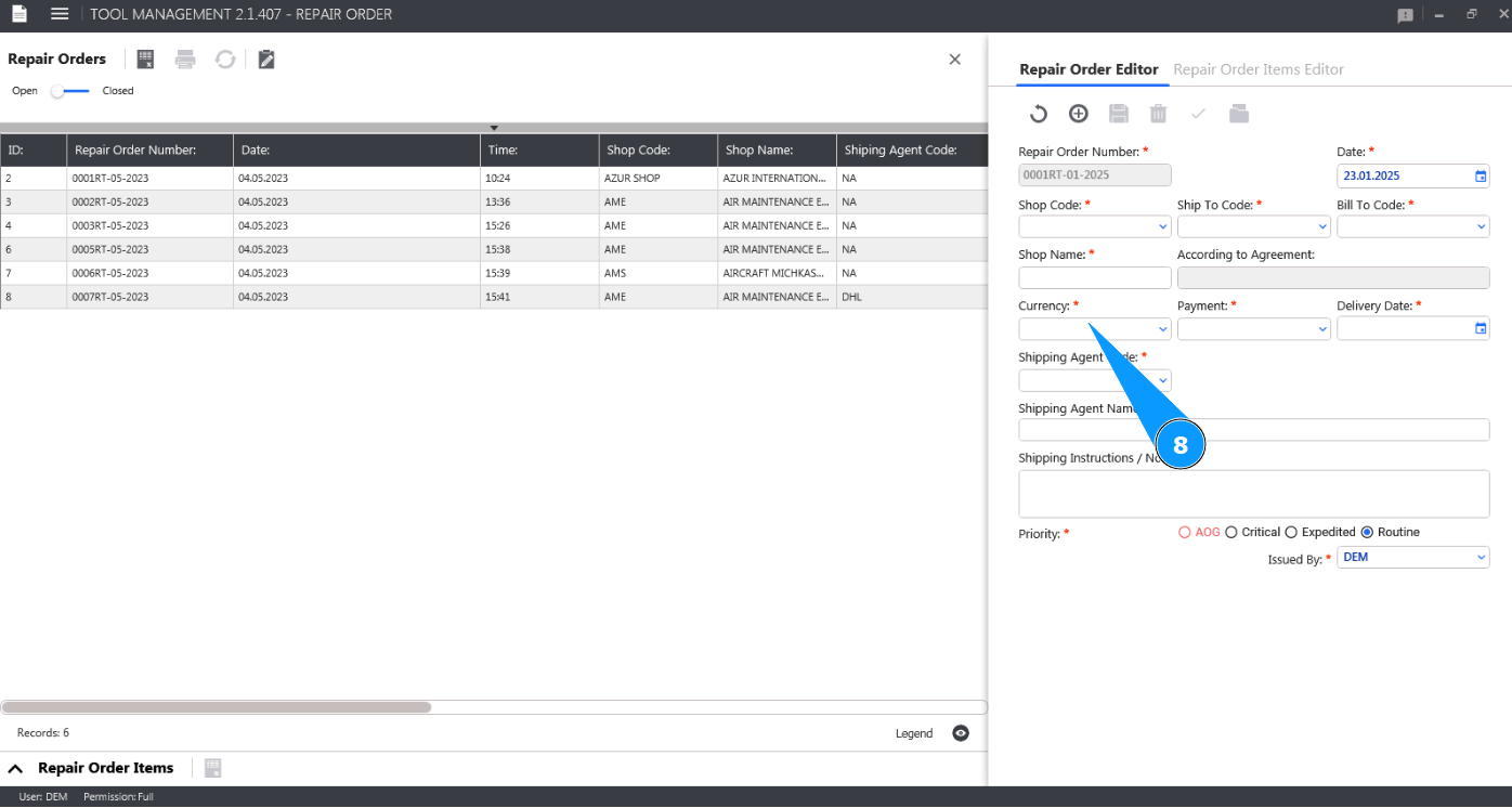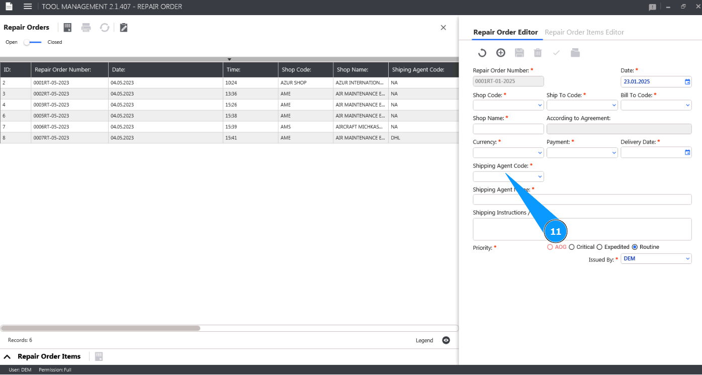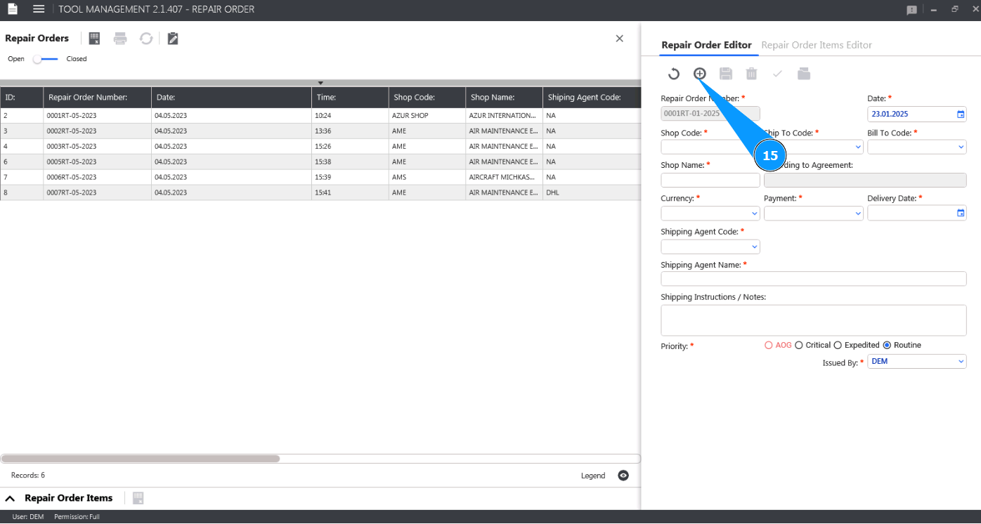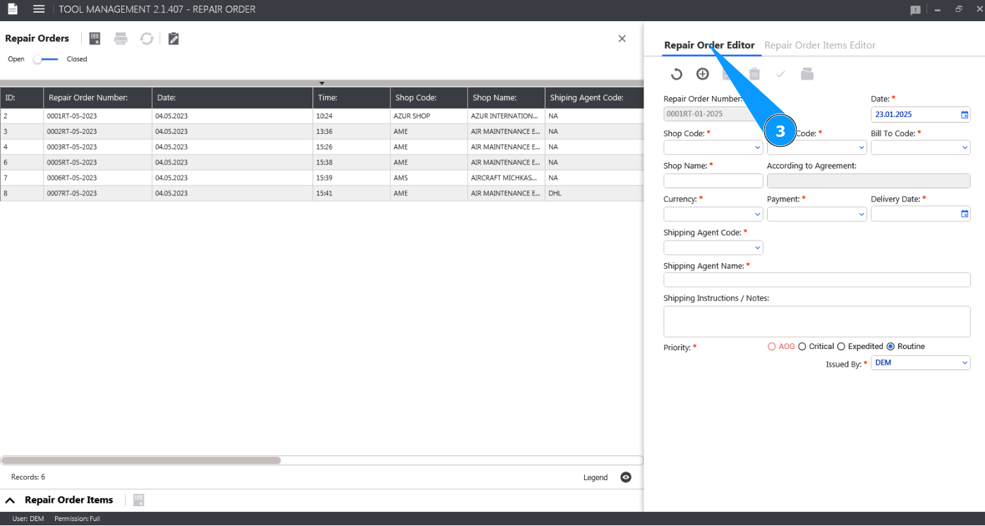 3. Check that the window "Repair Order Editor" opens. You need to fill it with data.