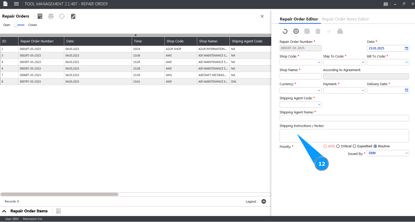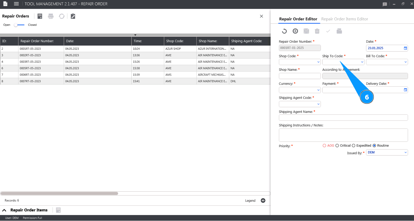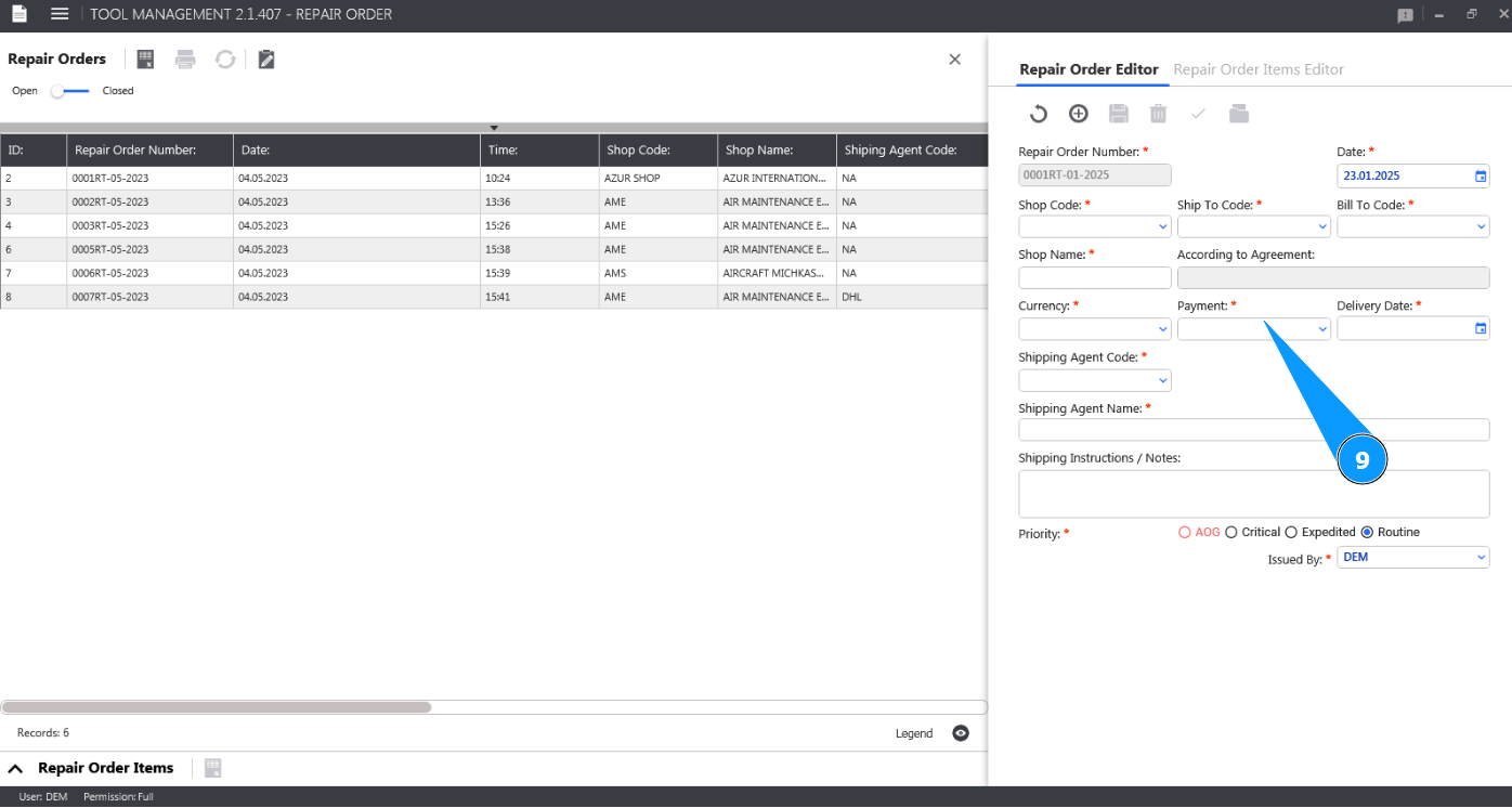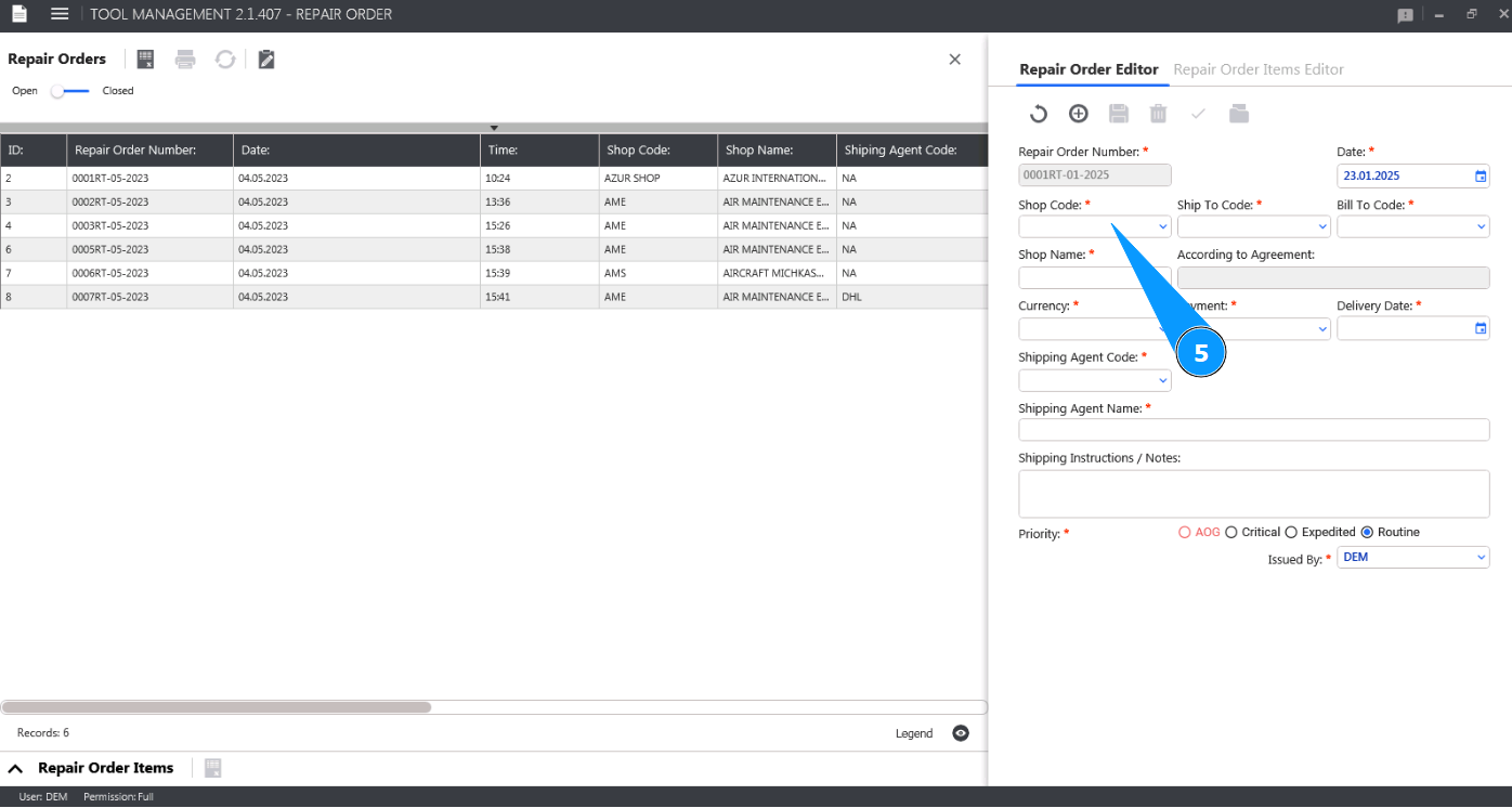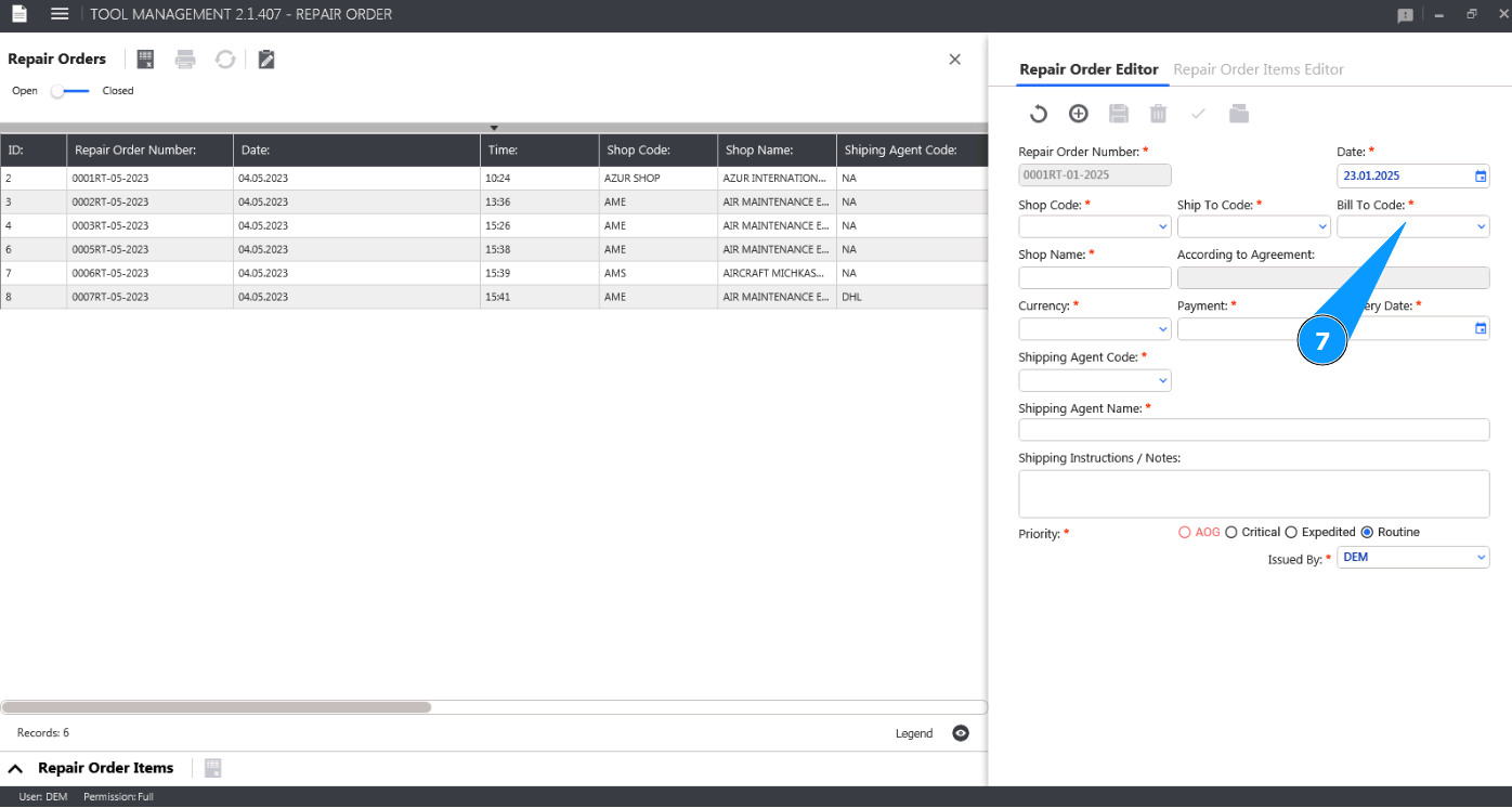 3. Check that the window "Repair Order Editor" opens. You need to fill it with data.