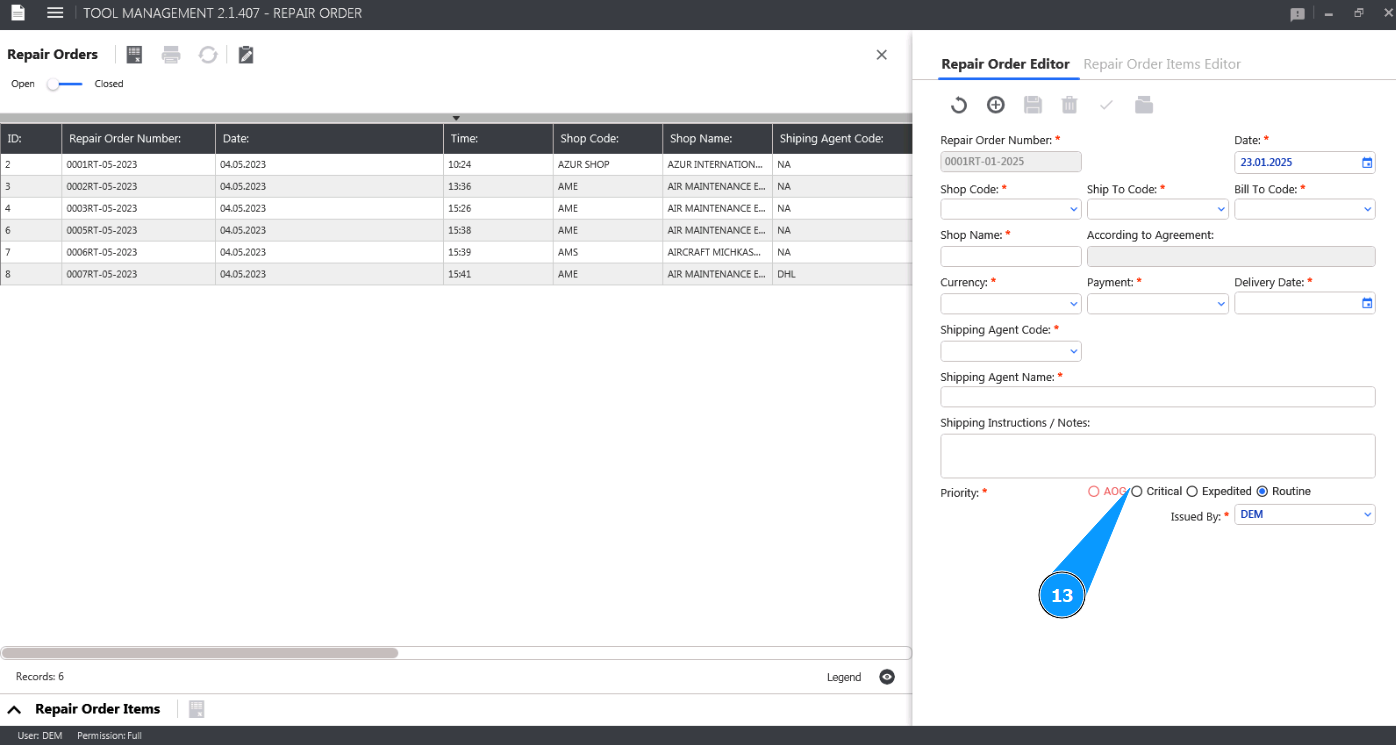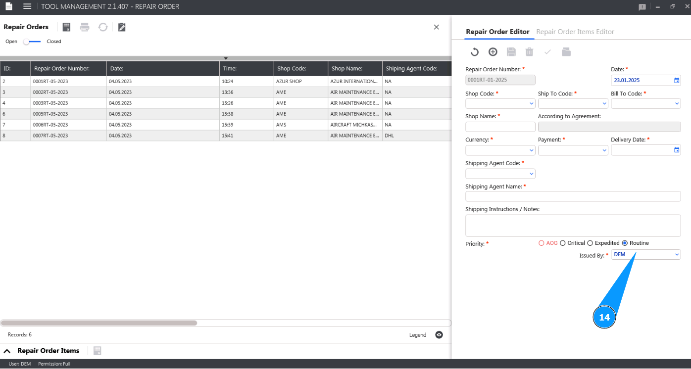 14. Select the login of the personnel who created the Repair Order from the dropdown list in the field "Issued By".