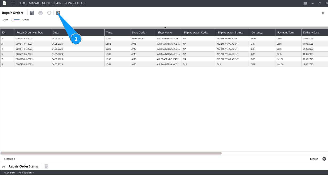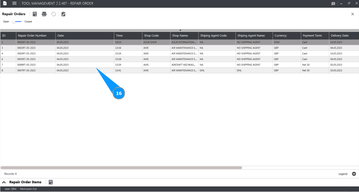 16. Check that your Repair Order is displayed in the window "Repair Orders".