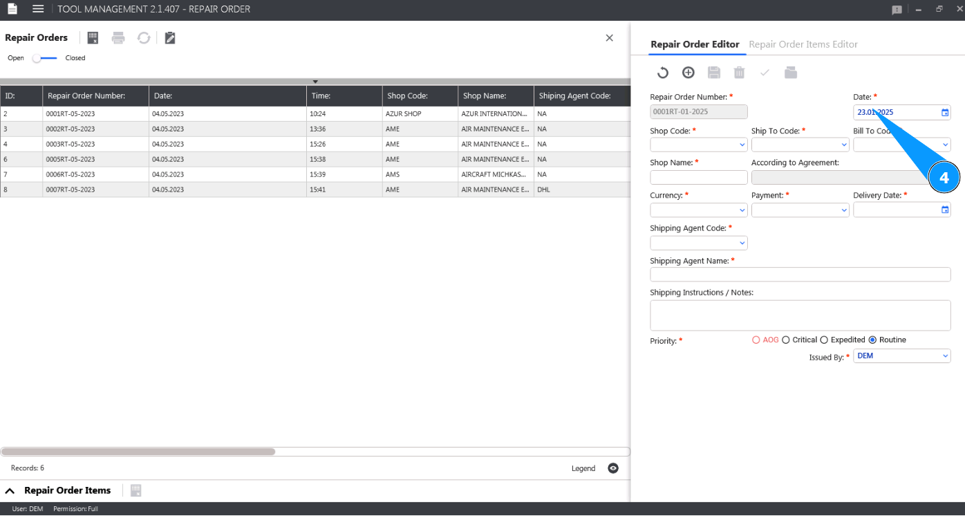 4. The current date is set by default. If necessary, change the Repair Order creation date. Note: The Repair Order number (abbreviated RO) is created by the program automatically, without the ability to edit.
