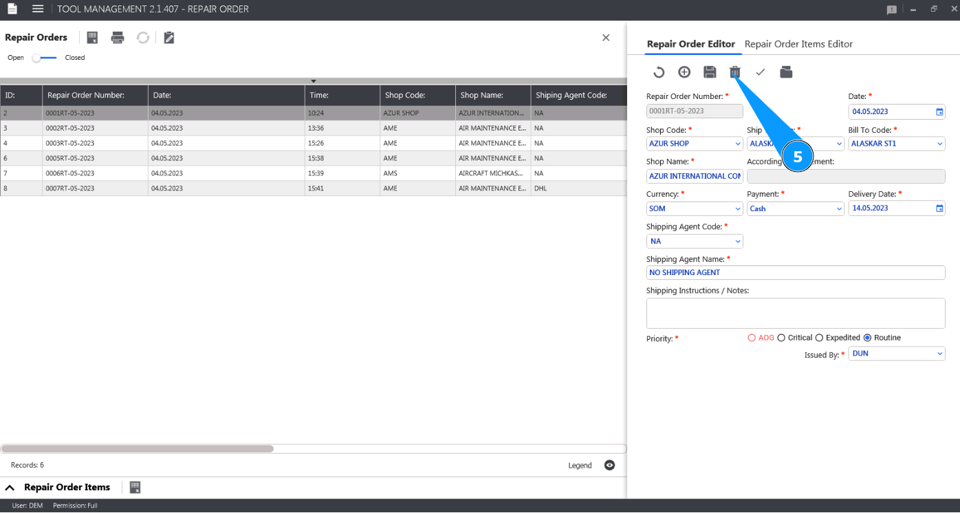 2. Select the Repair order you want to delete from the list, and click on the corresponding line in the window "Repair Orders".