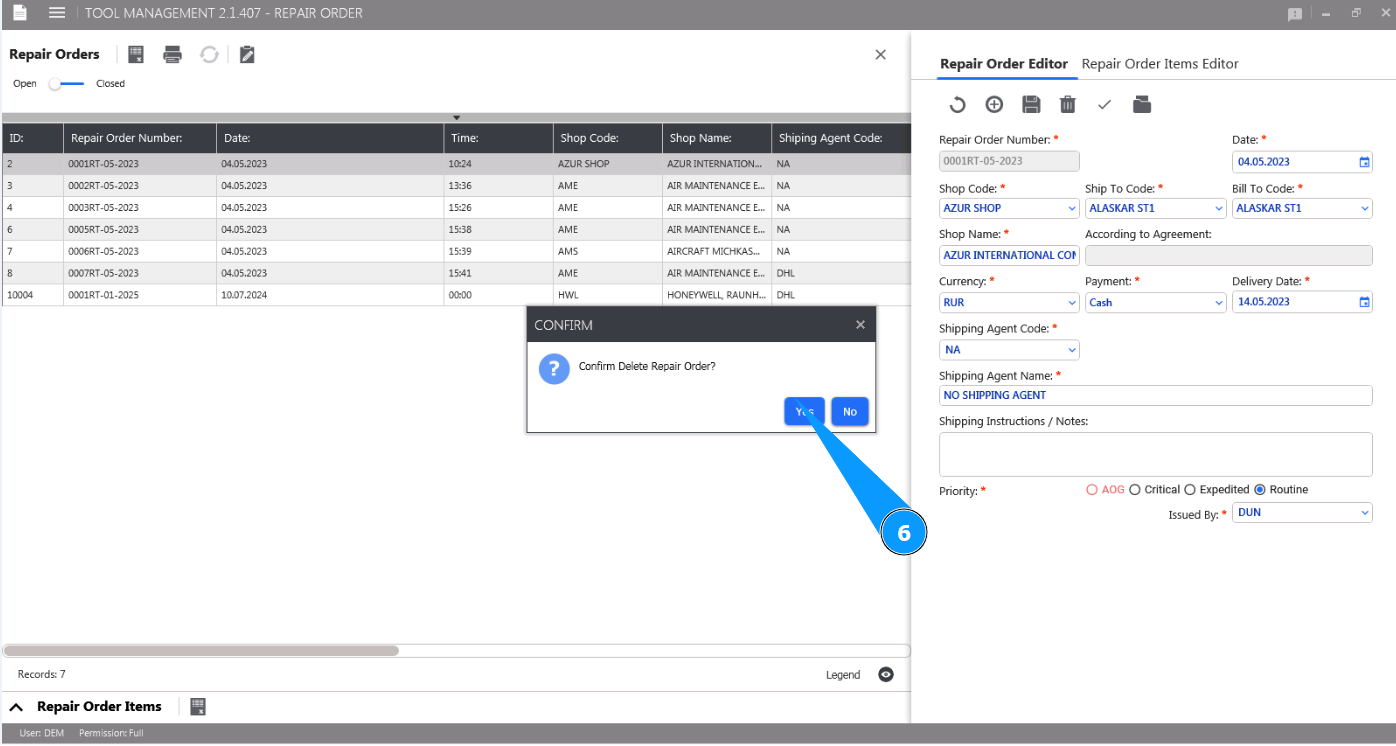 6. Click on the button "Yes" to confirm deletion of the Repair Order.