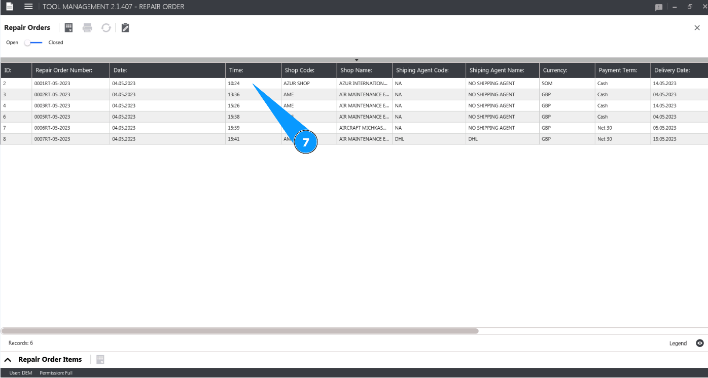 7. Check that the Repair Order has been deleted in the window "Repair Orders".