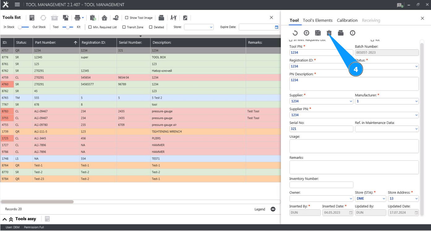 9. Check that the tool card has been successfully deleted in the window "Attachment List".