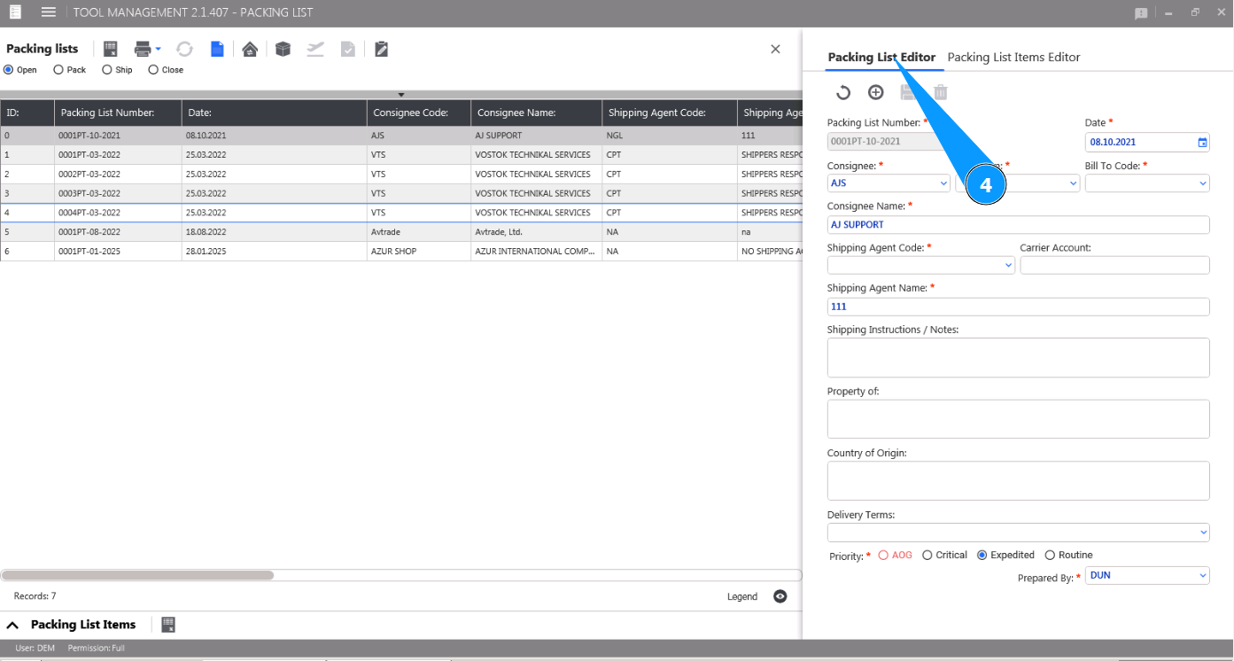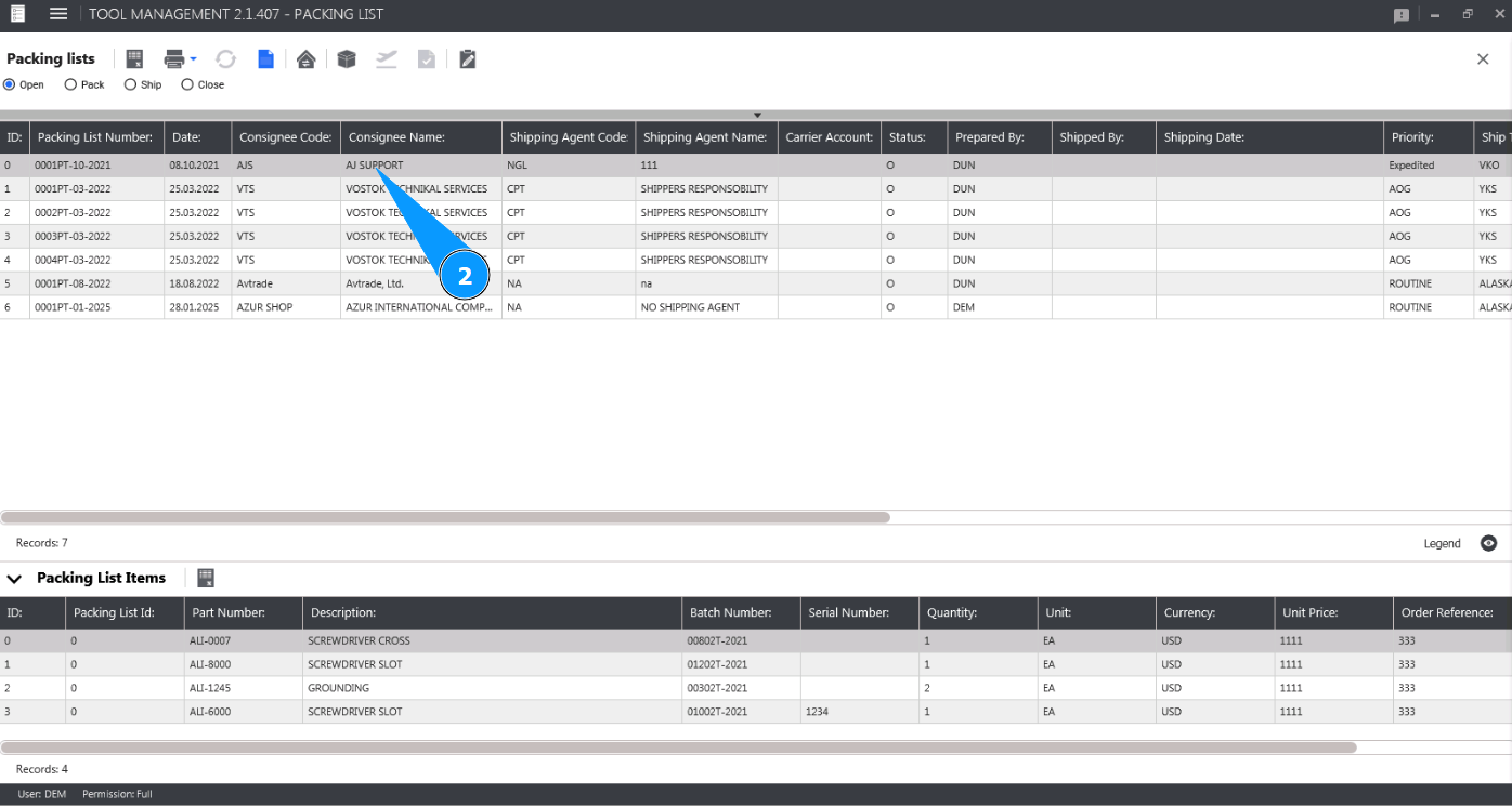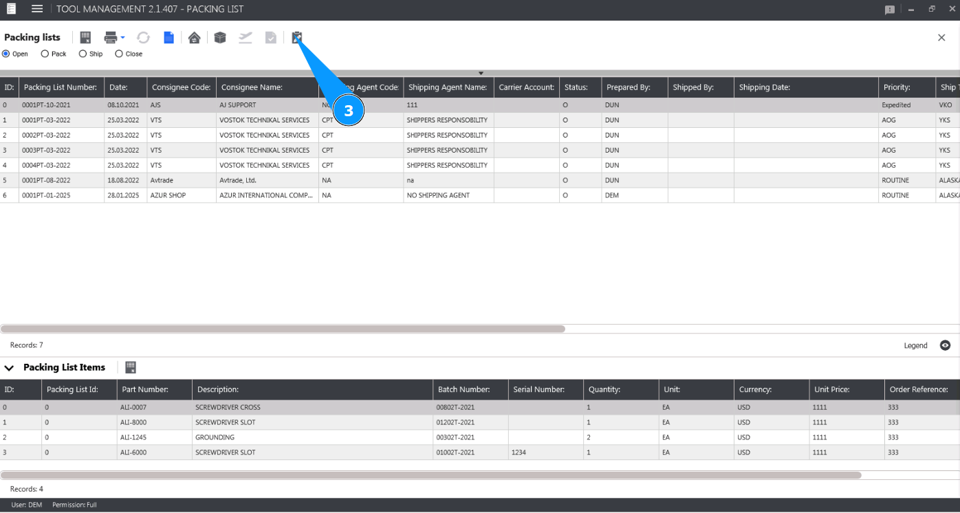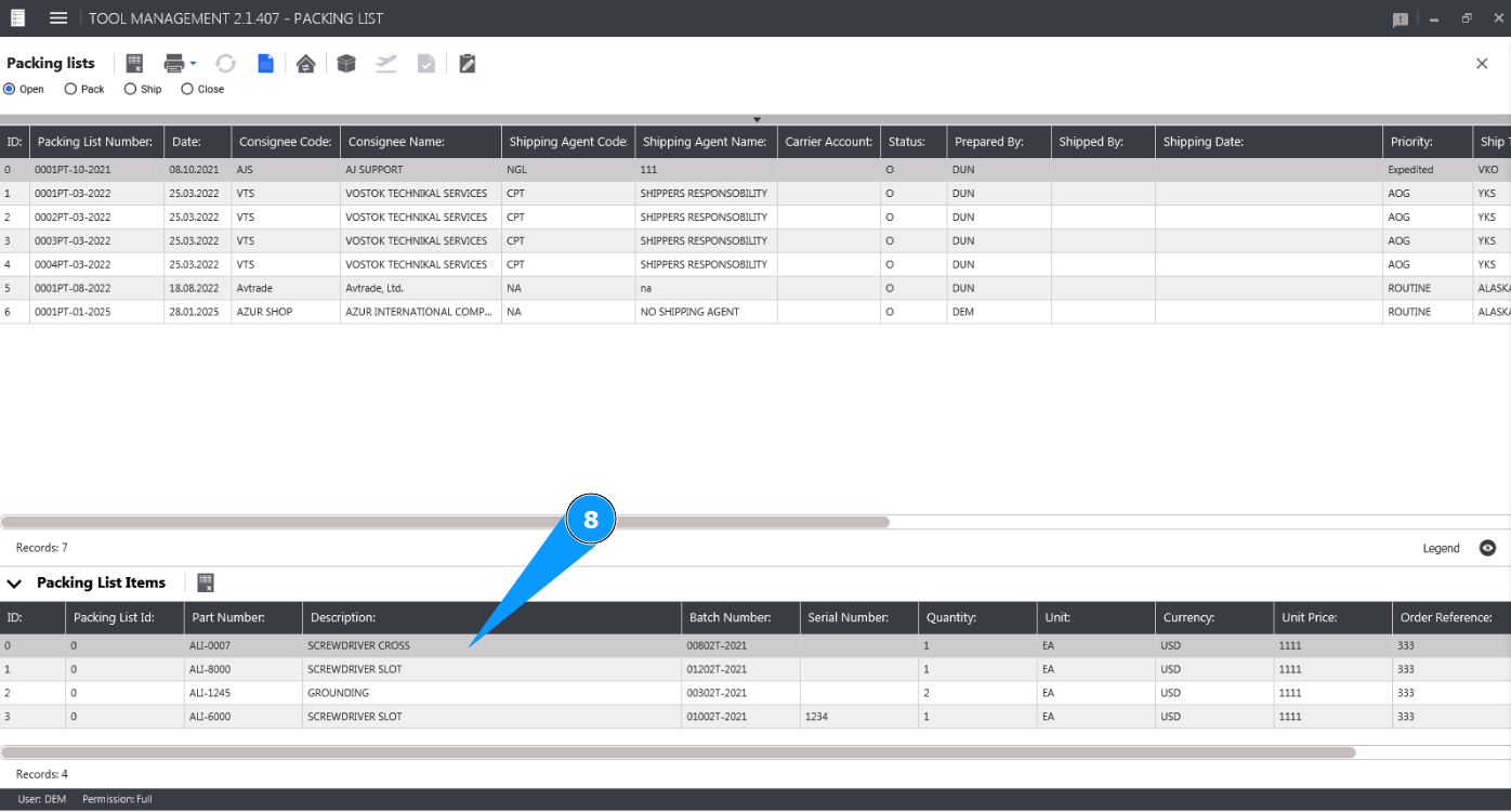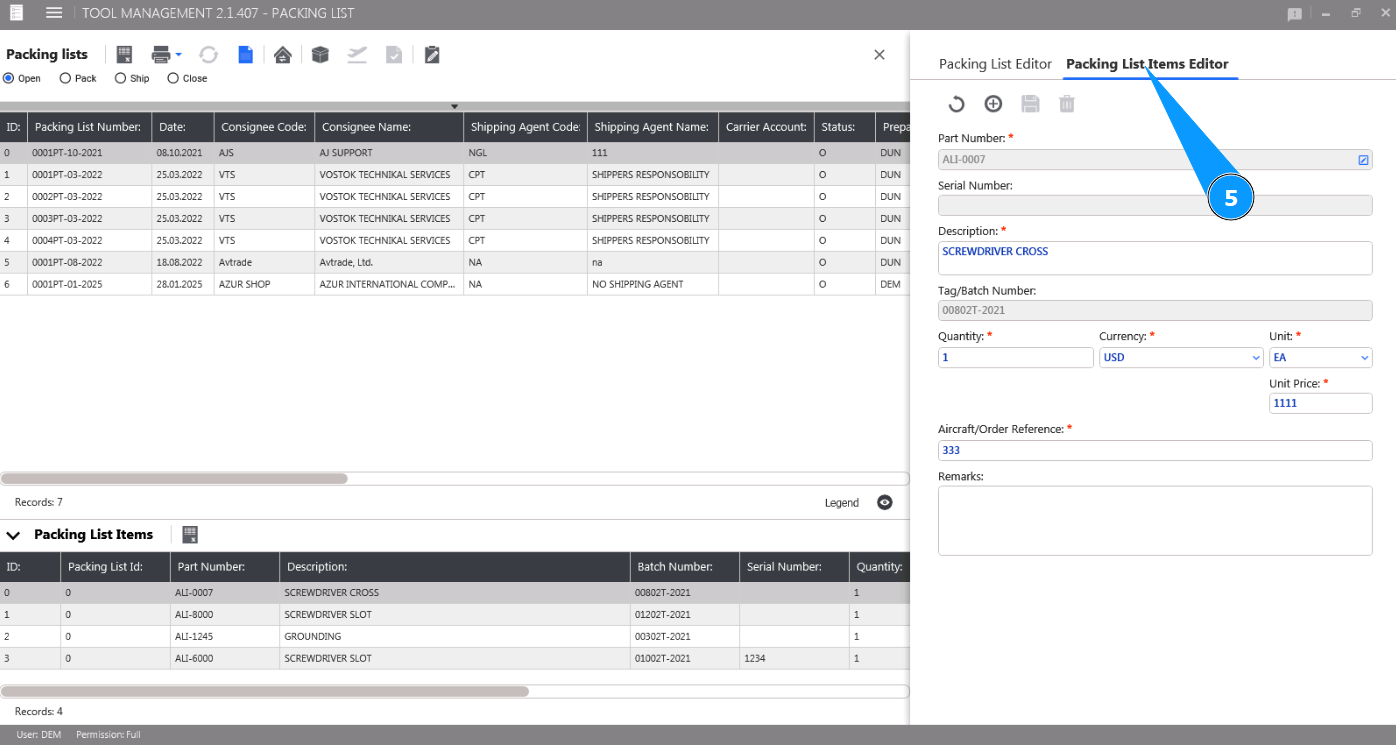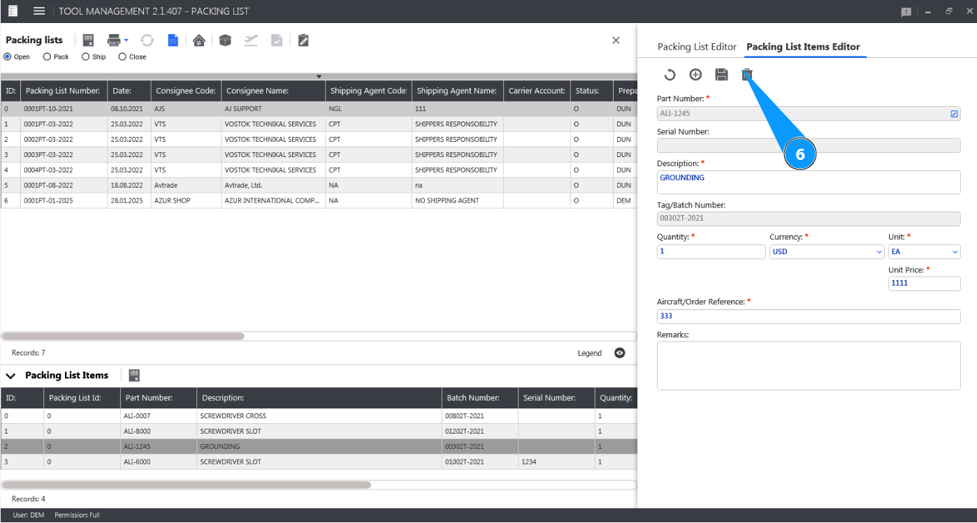 8. Check the deletion of the tool from the Packing List card in the window "Packing List Items".