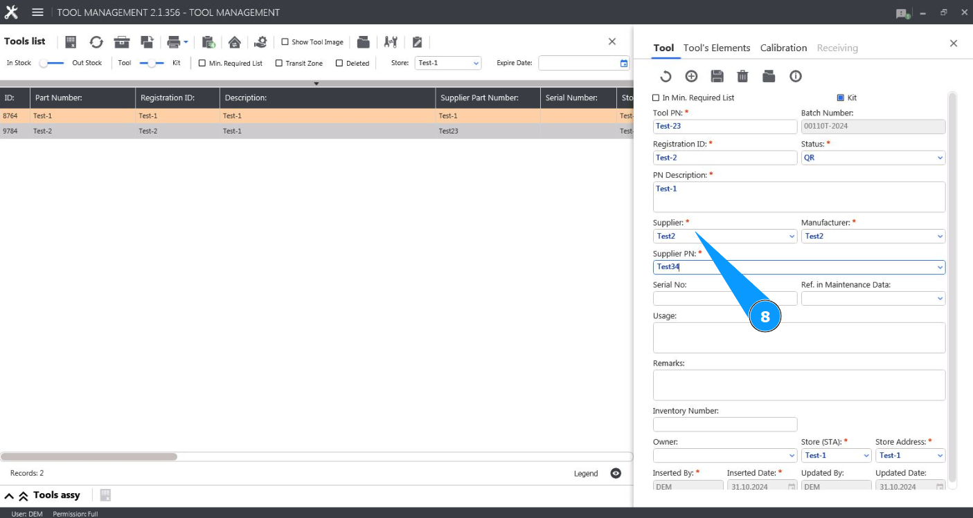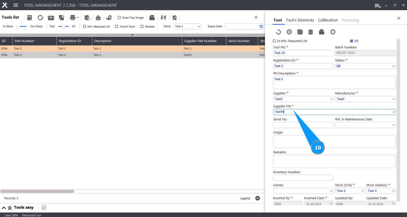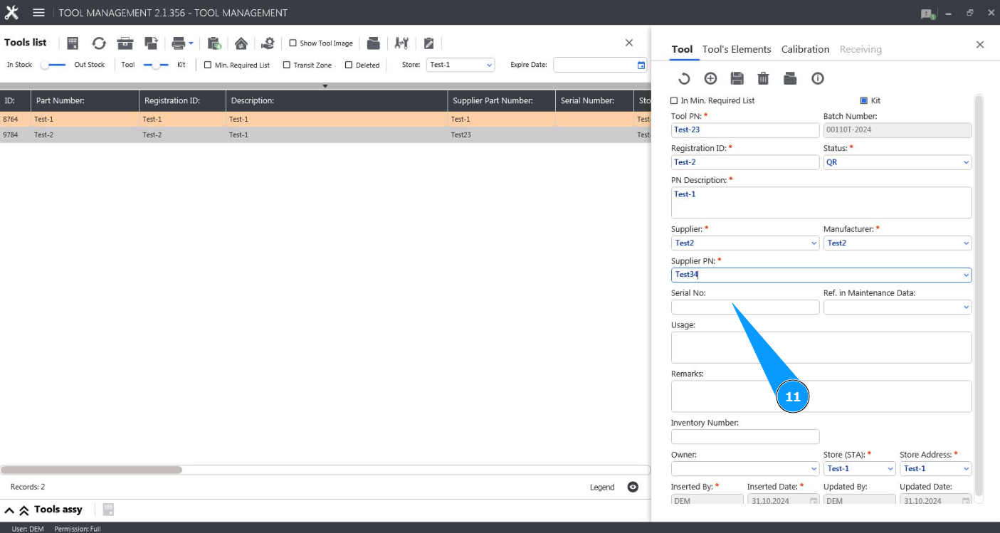 10. Enter the part number of the tool supplier in the field "Supplier PN".