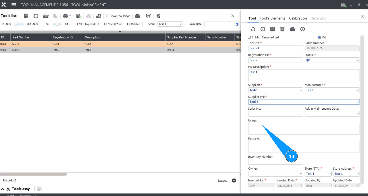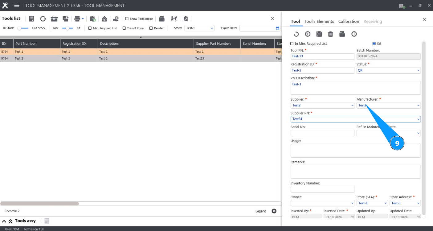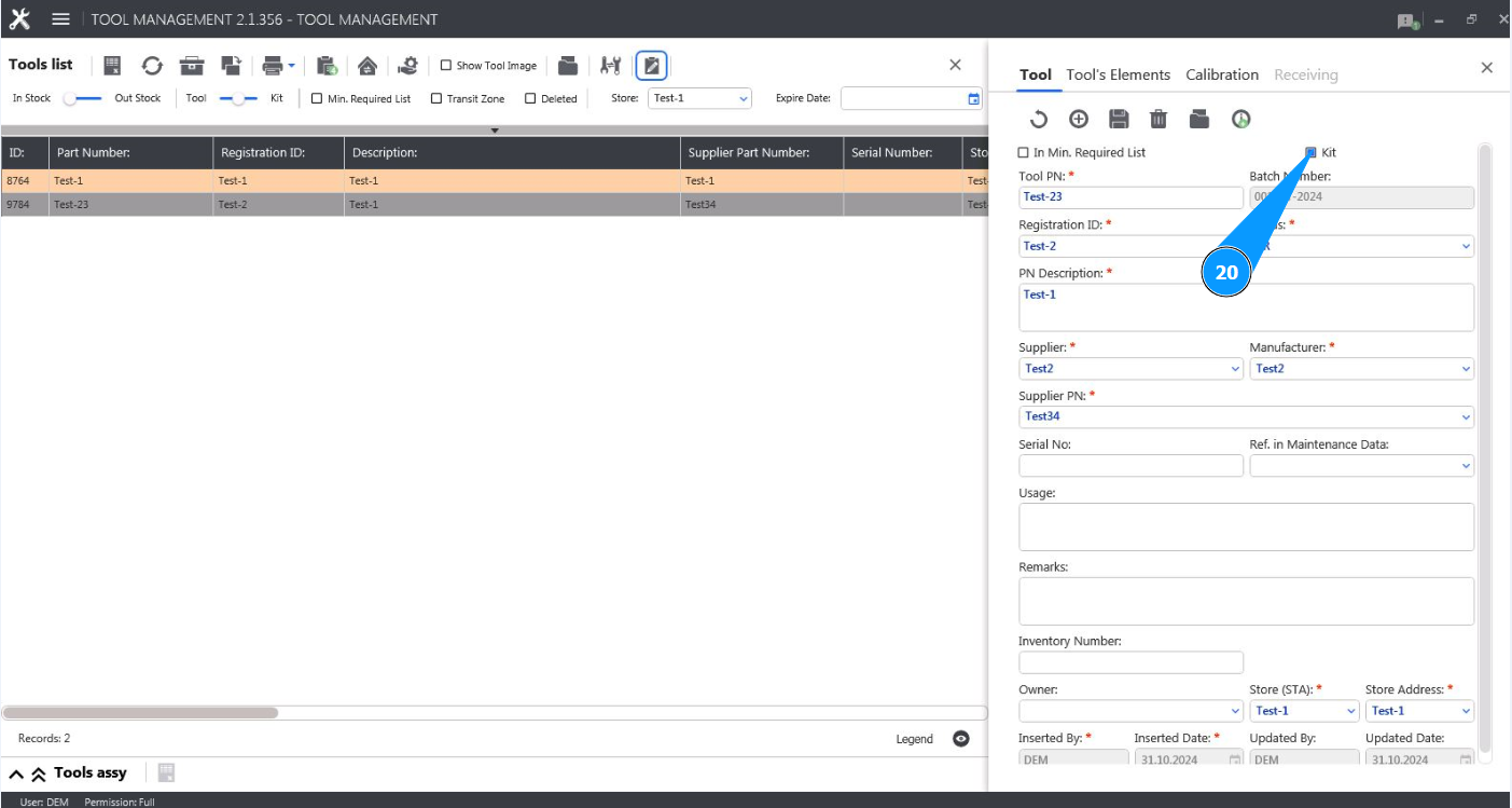 20. If necessary, put a marker that the tool is included in the kit in the field "Kit".