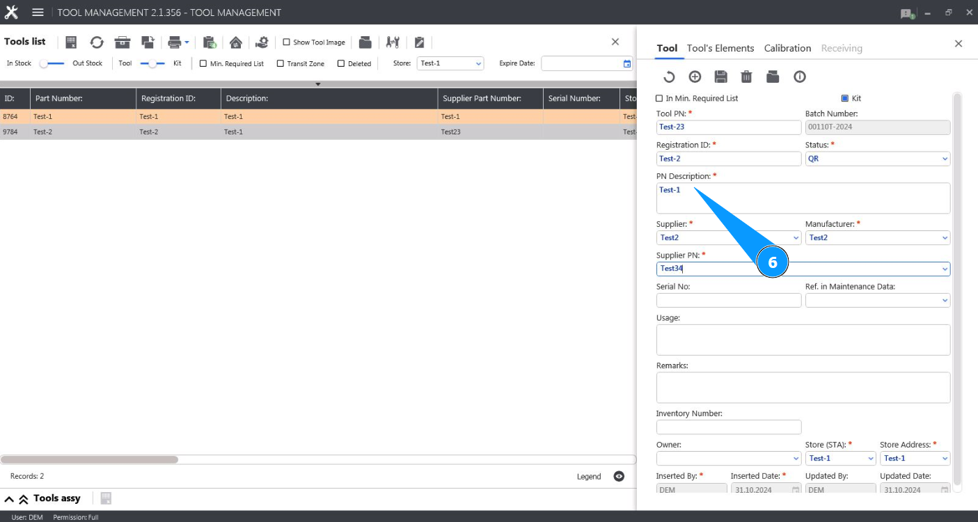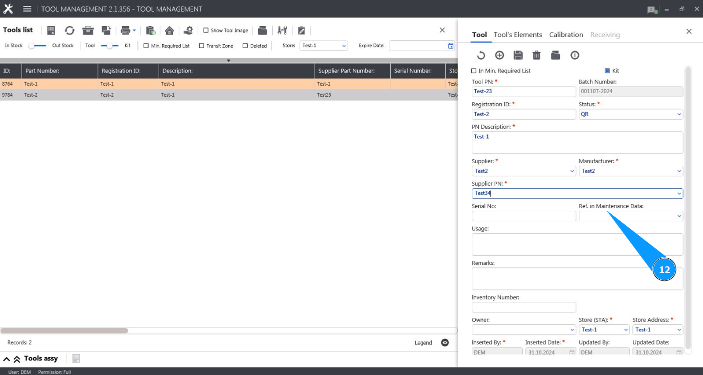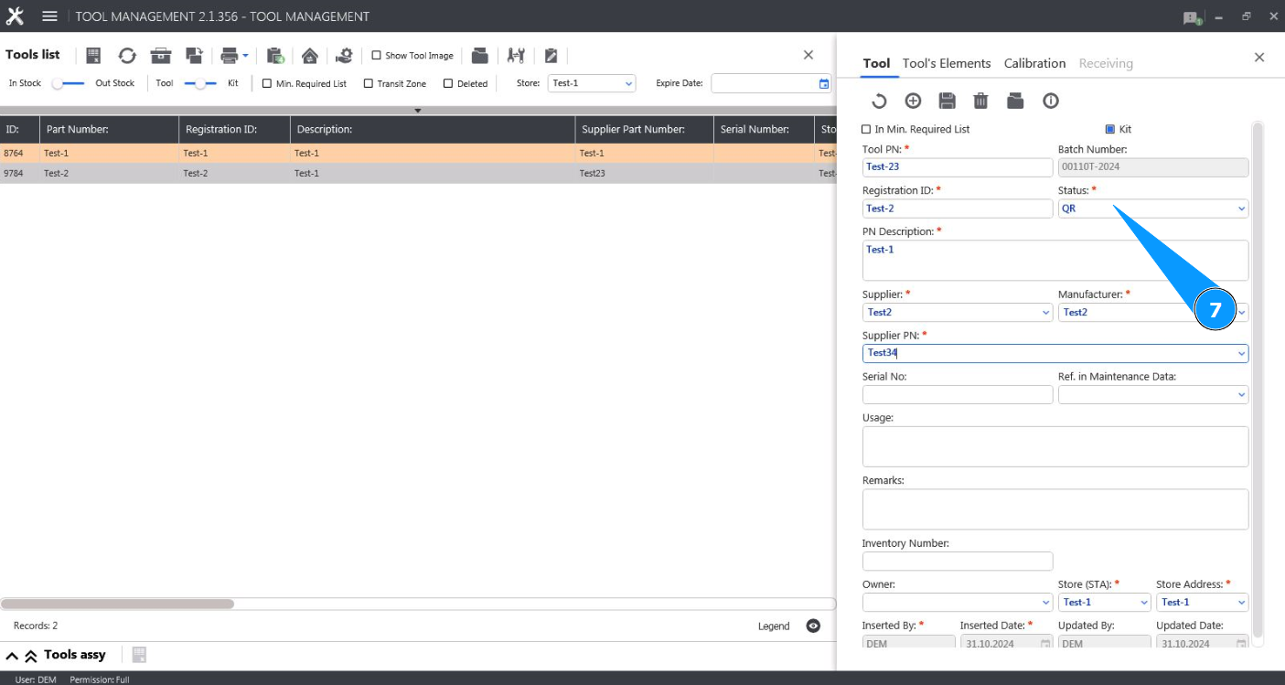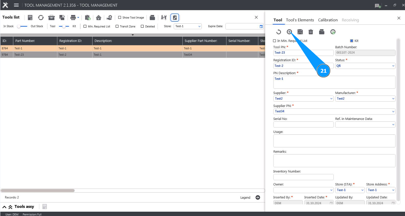 20. If necessary, put a marker that the tool is included in the kit in the field "Kit".
