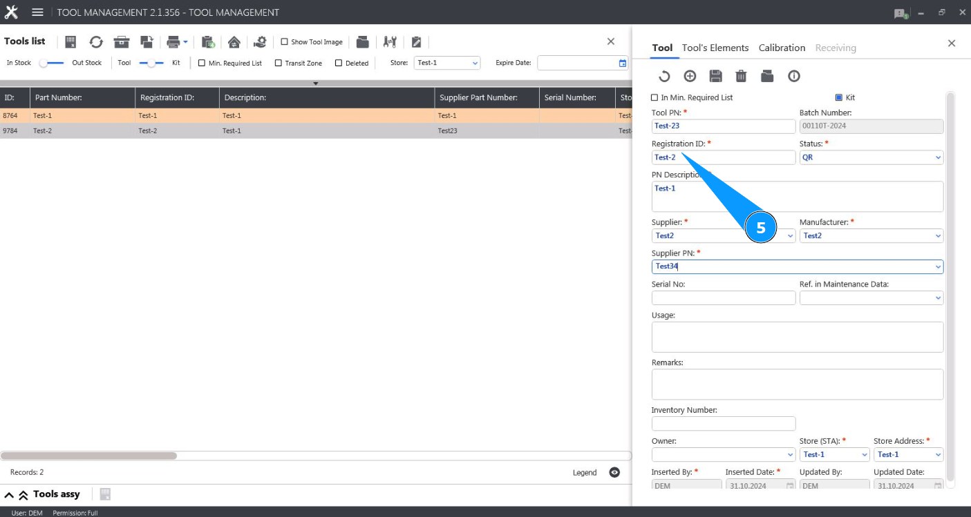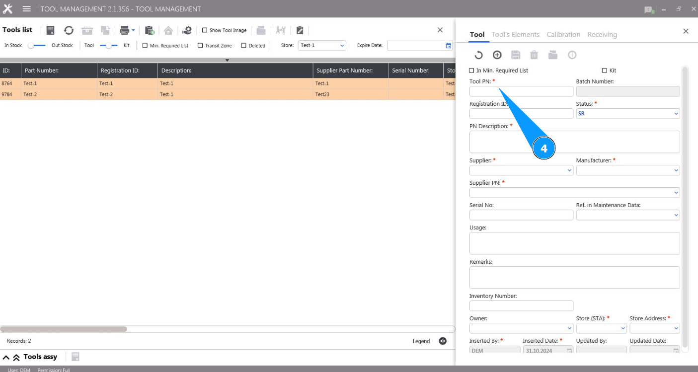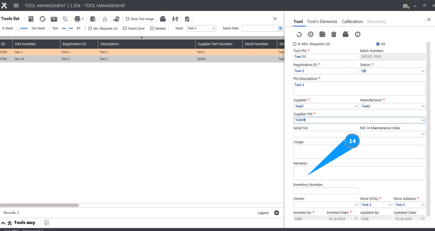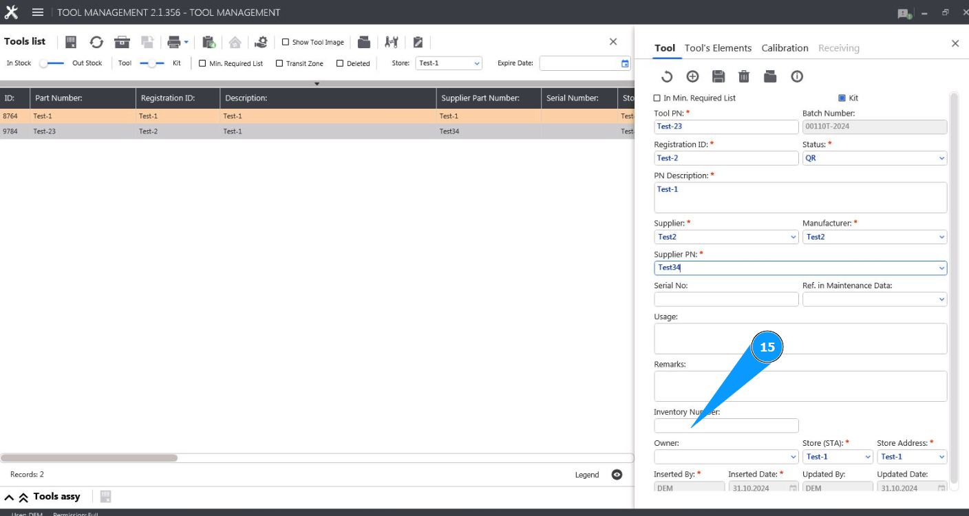 15. If necessary, enter the tool's inventory number in the field "Inventory Number".
