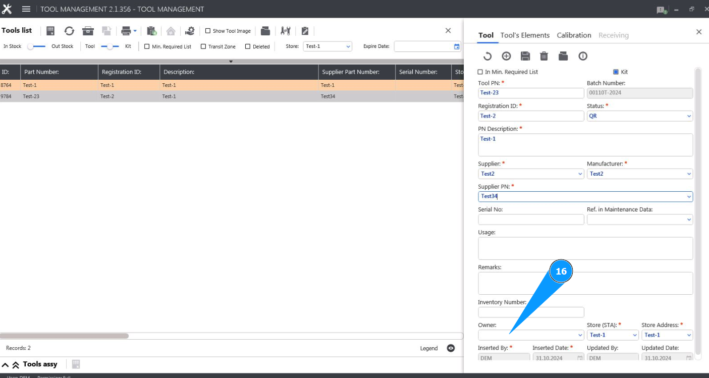 16. If necessary, enter the name of the tool owner in the field "Owner".