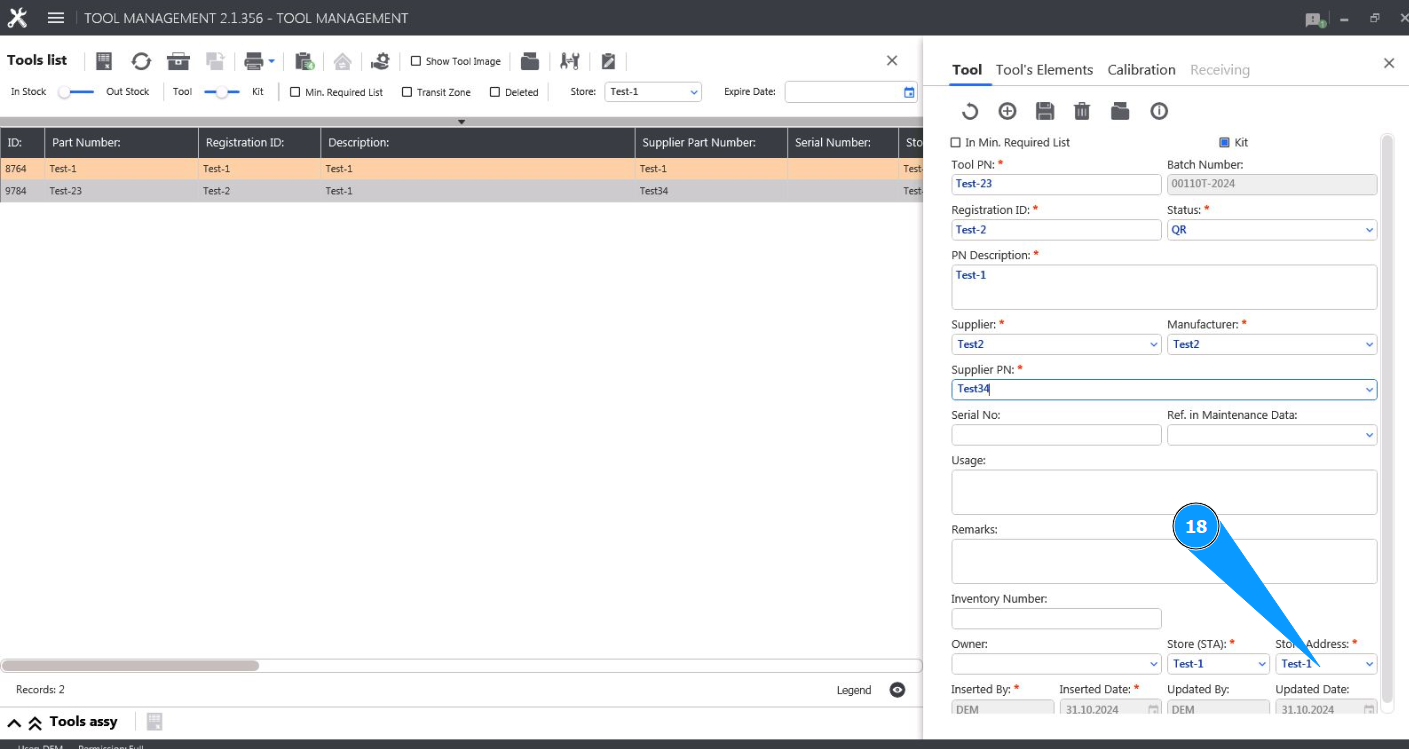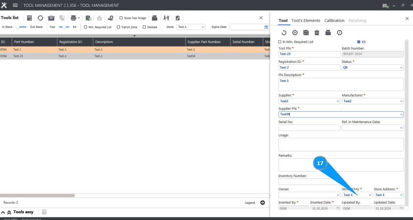 18. Enter the storage location of the tool in the field "Store Address". Note: The login of the specialist who entered the tool data and the date of entry will be displayed by the program automatically in the fields "Inserted By" and "Inserted Date".