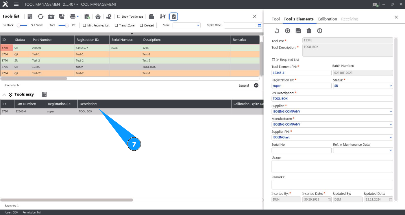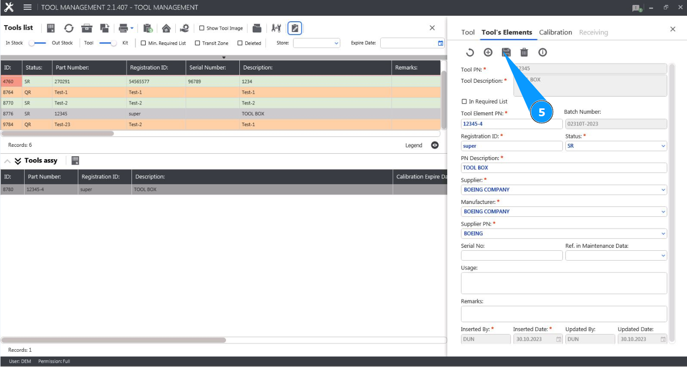 3. Select the required line with the tool kit element and click on it in the window "Tool Assy".