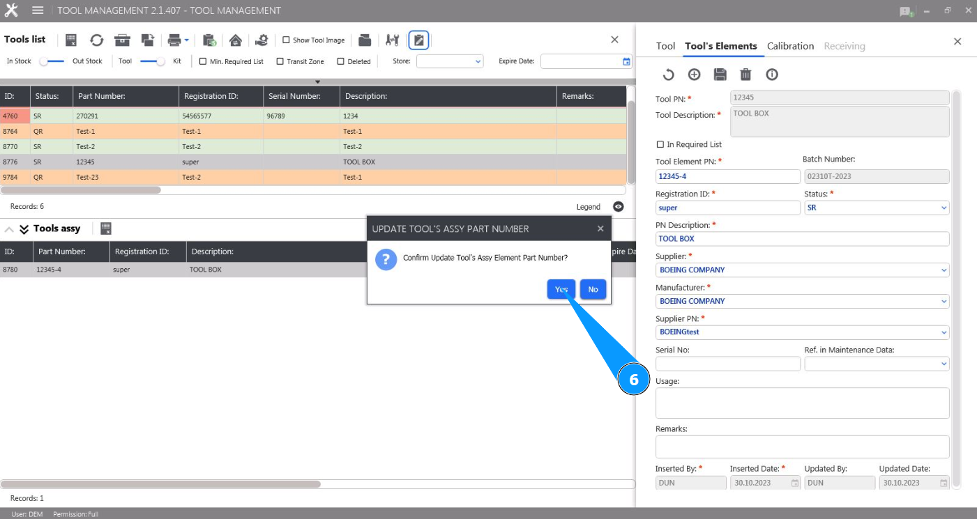 6. Click on the button "Yes" to confirm updating the data in the tool kit element.