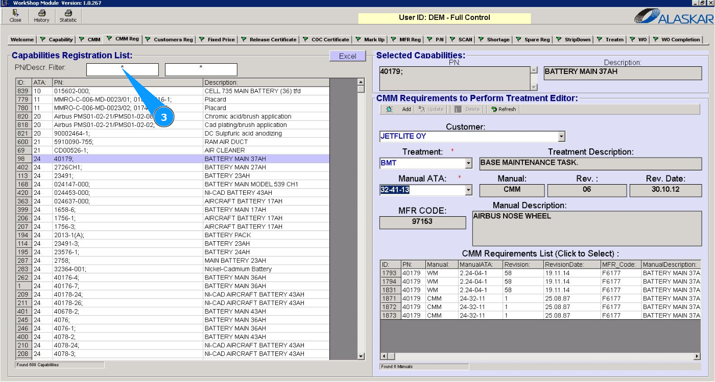 3. Select p/n for which you need to specify threatment. Enter the required part number in the search field "PN/Descr.Filter" and press the button "Enter" on your keyboard.