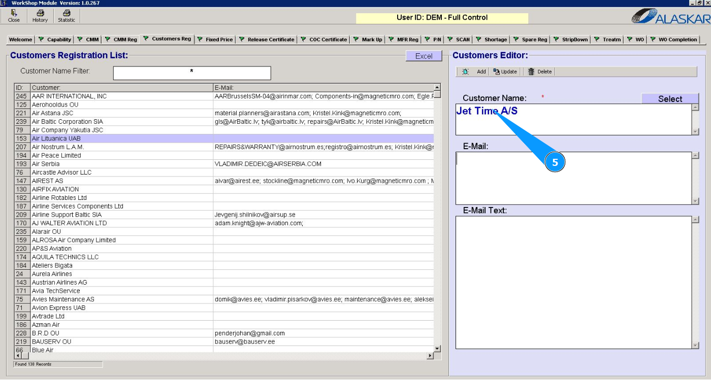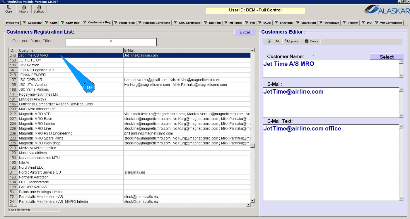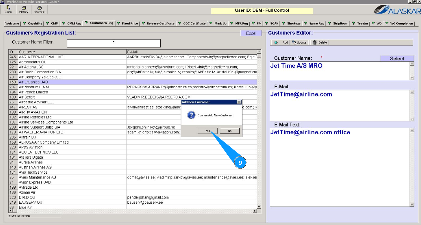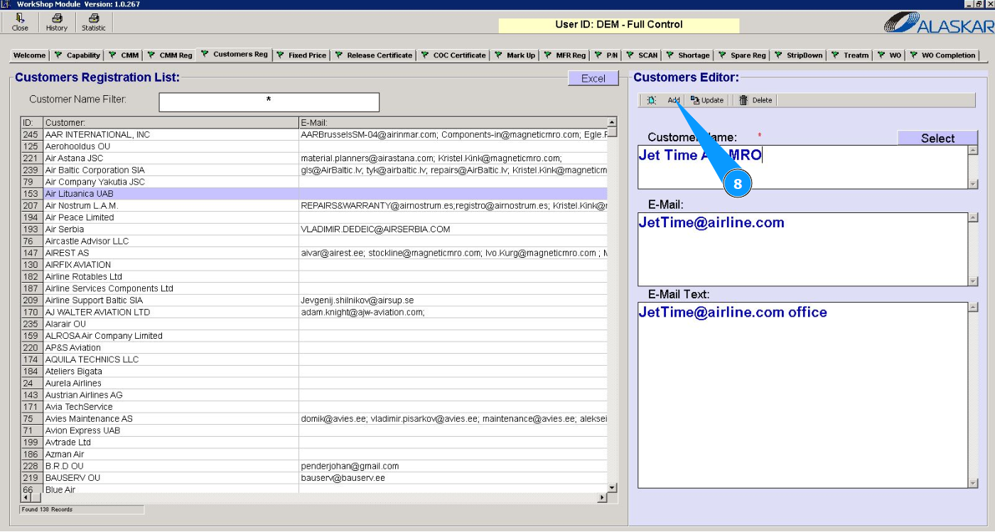 10. Check that the new customer is displayed in the window "Customer Registration List".