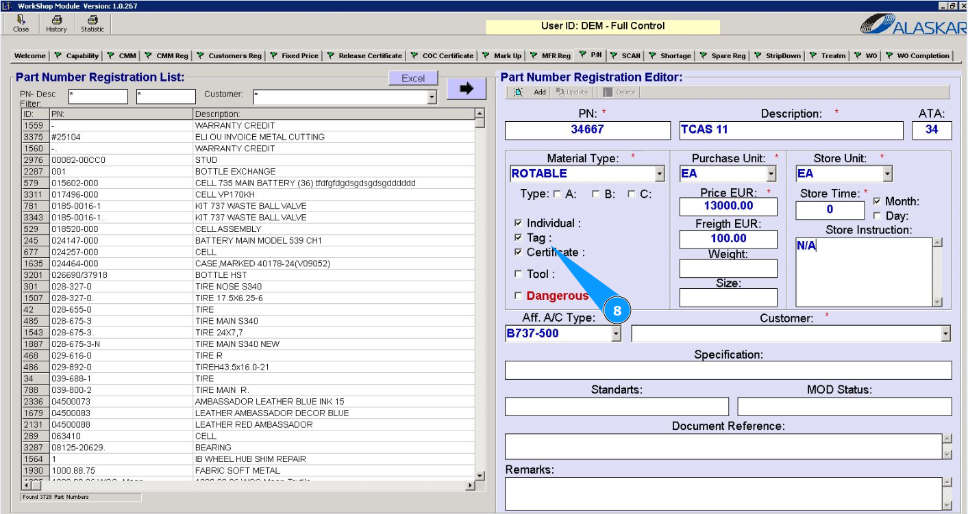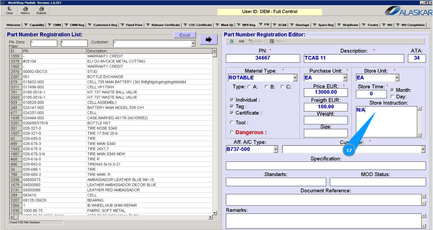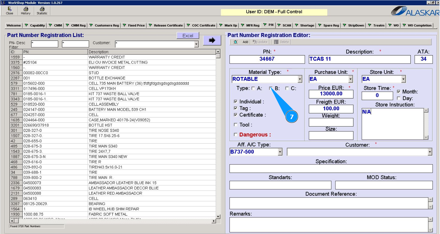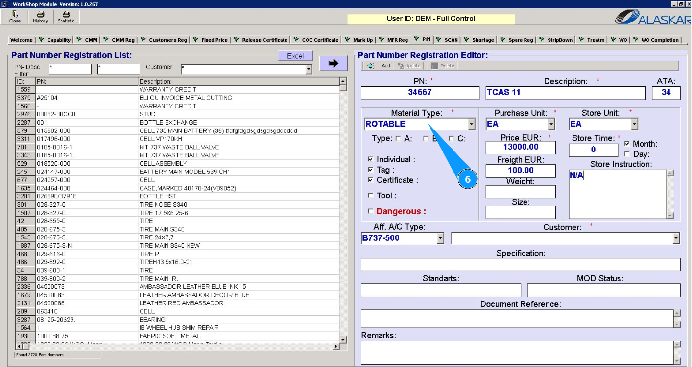 6. For components from the dropdown list, select the material type "Rotable" in the field "Material Type".