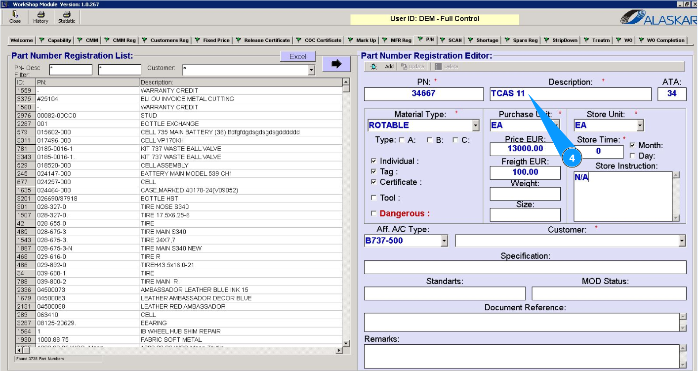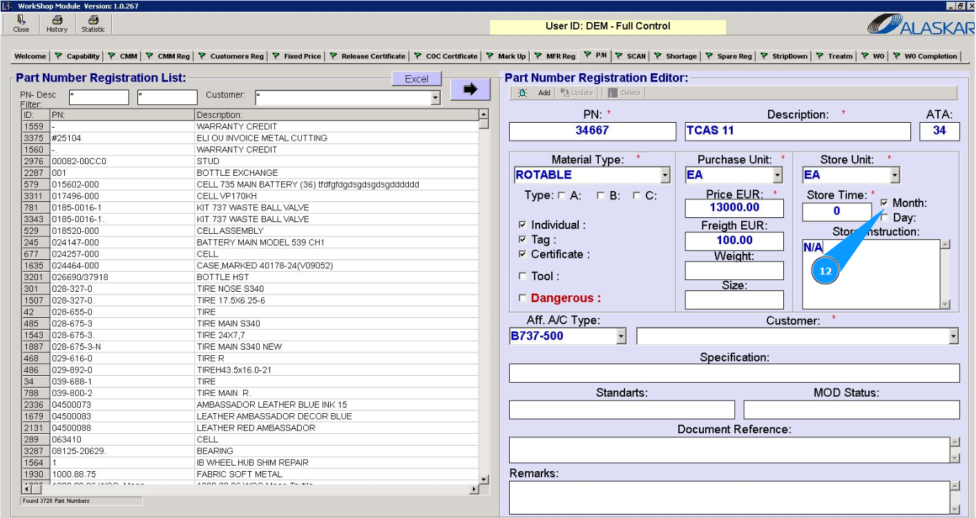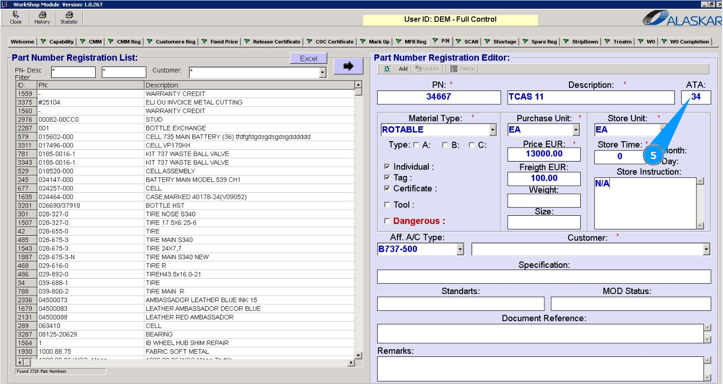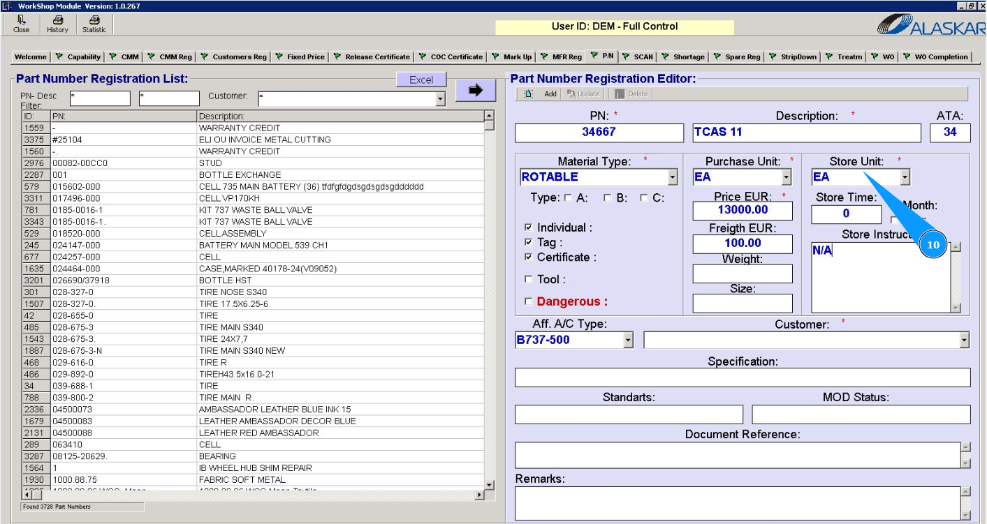 6. For components from the dropdown list, select the material type "Rotable" in the field "Material Type".
