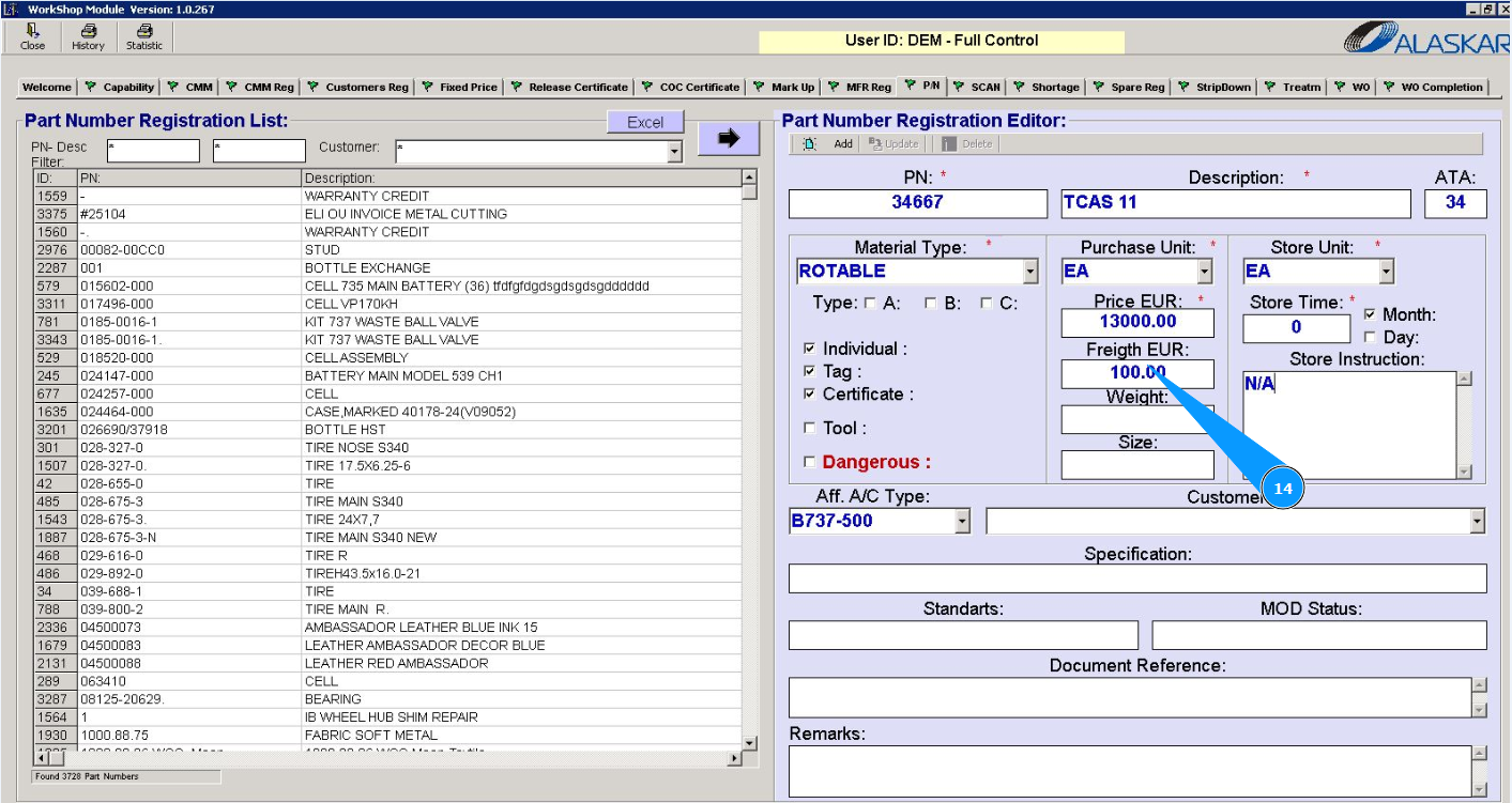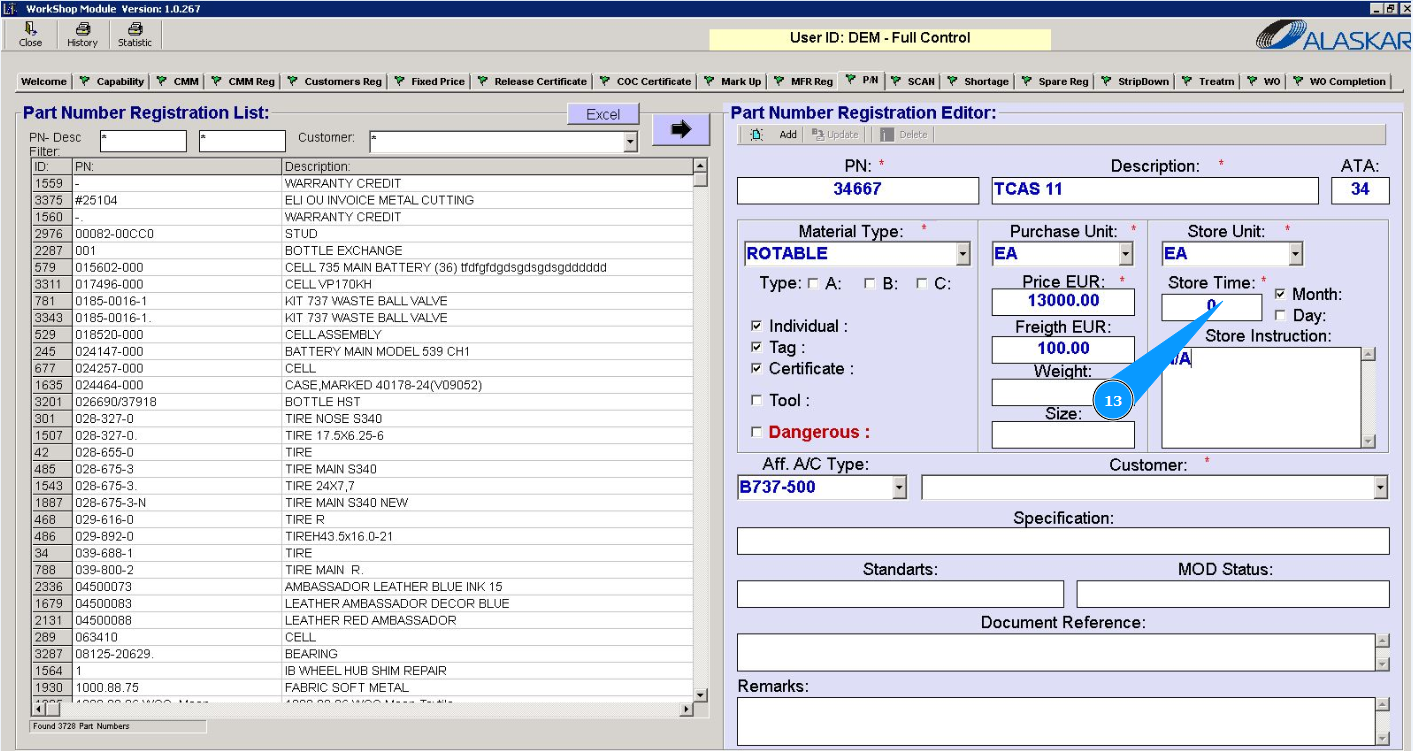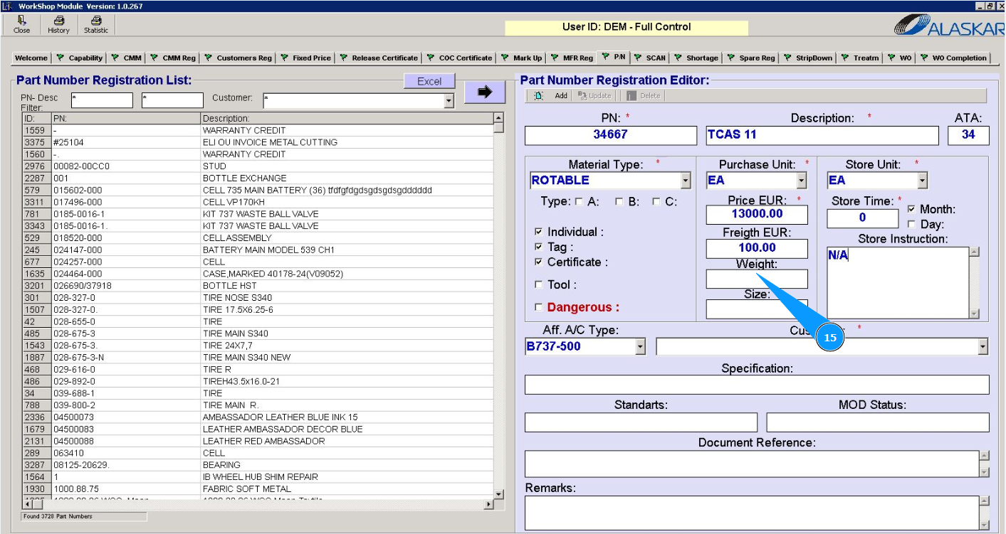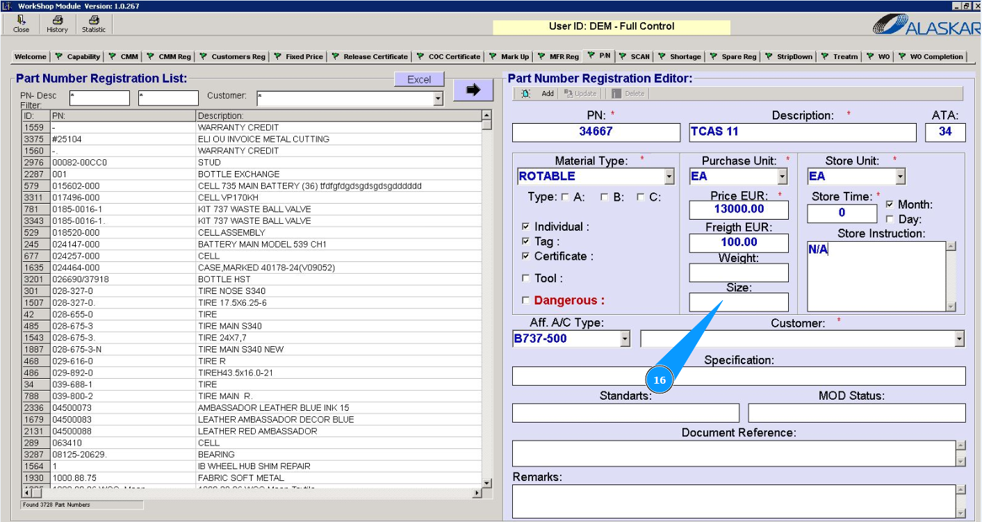 6. For components from the dropdown list, select the material type "Rotable" in the field "Material Type".